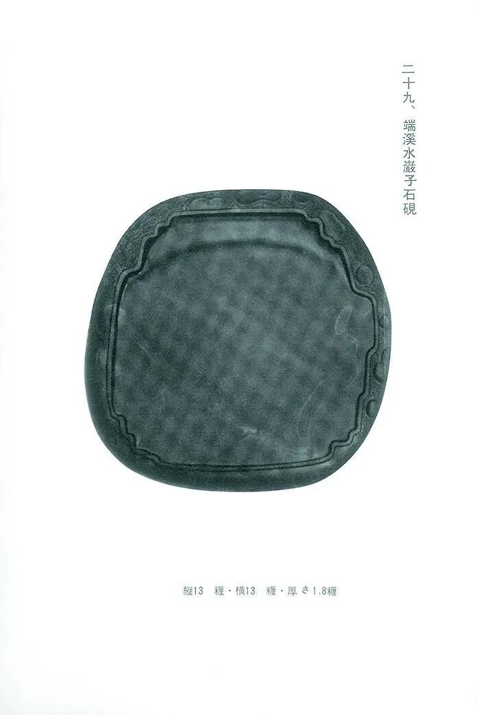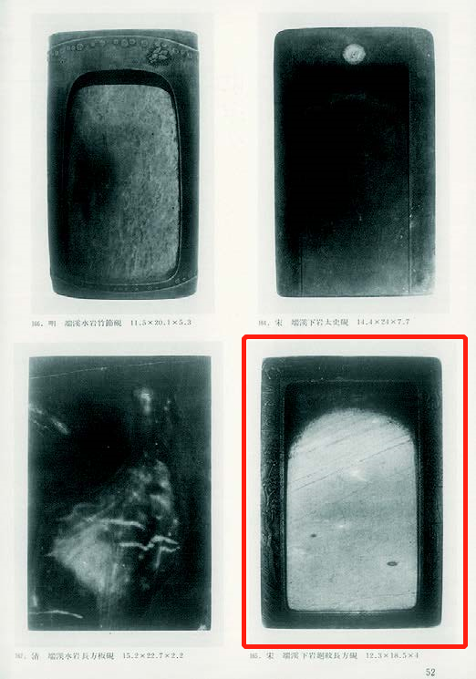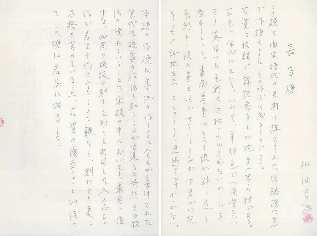 尤为难得的是,本品应为日本古砚收藏大家相浦紫瑞旧藏,并具两份相浦紫瑞手书鉴定书,内容大致如下:(一)此砚是南宋時代晚期开采的端溪下岩石,石质卓著,锋芒密密,为水坑下岩一等砚材,石色为宋代的羊肝色。此砚琢墨池之工甚佳,当属宋砚最高水准,四周回纹,雕刻精绝,确为名家之作,砚中名品。(二)此砚材是南宋中期采出,偏实用之制式,有明显的时代特征,明早期也可见此砚式。通过两份鉴定书,可知相浦紫瑞对本品甚为推崇。有一点值得指出,鉴定书中称其回纹精绝,另两次日本早年著录中,亦取名“回纹砚”。可知,此处“回纹”与我们常说取材云雷纹之回纹不同,当指围绕砚缘满饰一周之意。观其主体纹饰之下,还有细碎似螺纹的背景,可见雕琢之精。背铭文“既静以寿,虽磨不磷。他山之石,明德惟馨”、钤印“润斋”、带盒