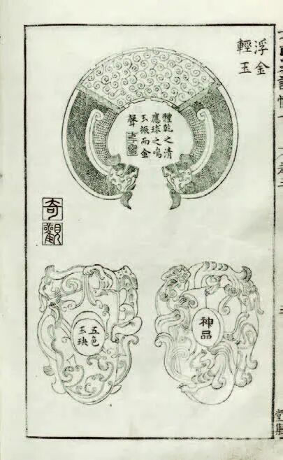 参阅:《香远益清—唐宋香具览粹》,浙江省博物馆、法门寺博物馆编,中国书店2015年,第126页《方氏墨谱》中载一式墨,名曰“浮金轻玉”,即以此式玉璜为本,足见此式于明晚期之流行。参阅:《方氏墨谱》卷三,(明)方于鲁编,万历十六年(1588年)刊本,图五