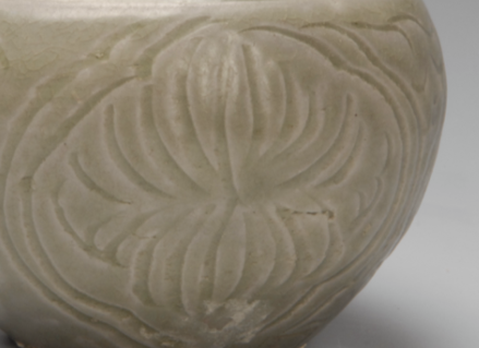 越窑以制作青瓷而闻名,窑址主要分布在浙江上虞、慈溪、余姚等地。越窑青瓷的发展伴随唐代社会经济文化的繁荣而提升。越窑于晚唐开始进入它的黄金时期,所制的青瓷同丝绸一起成为主要的对外出口商品。至五代,钱氏统治的浙东地区社会环境较为安宁,越窑瓷器也得以稳定发展。北宋早期,越窑制瓷业达到鼎盛。而宋代也是中国陶瓷史上的大发展时期,陶瓷的装饰技法繁多,有刻划花、压花、剔花、印花、戳花、镂花等。刻划花是刻花和划花的合称,“刻”、“划”是两种不同的瓷器装饰工艺和处理手法,刻花是指用刻刀在生坯上刻出纹样,线条呈斜状,一边深,一边浅,痕迹明显,纹路清晰。划花则是用竹针等工具在生坯上划出花纹,划痕较浅,称之为“划”,也是取其轻、浅之意,常见于填充器表的较大空白处,或用于主体造型轮廓的辅助划线,起到调整纹饰布局、平衡整体的作用。由于宋代瓷器纹饰在艺术处理上往往既有“刻”又有“划”,不便区分,所以一般统称为刻划花,刻划结合使纹饰有凸有凹,极富动感。