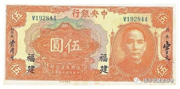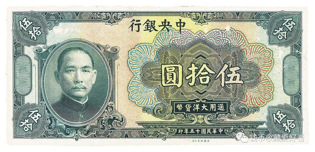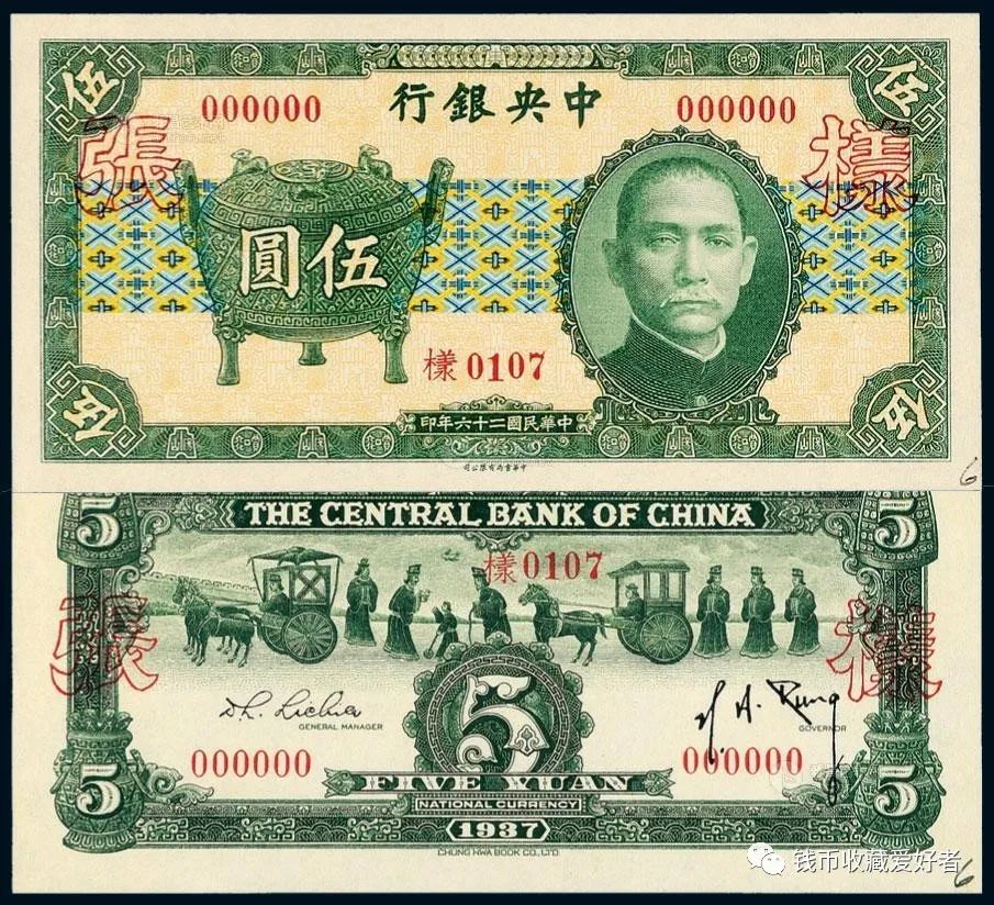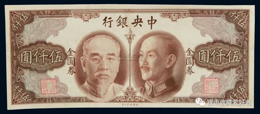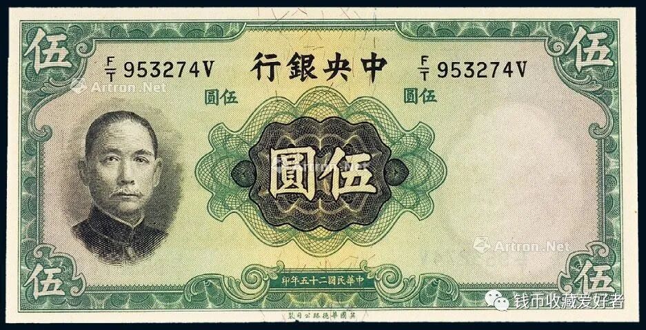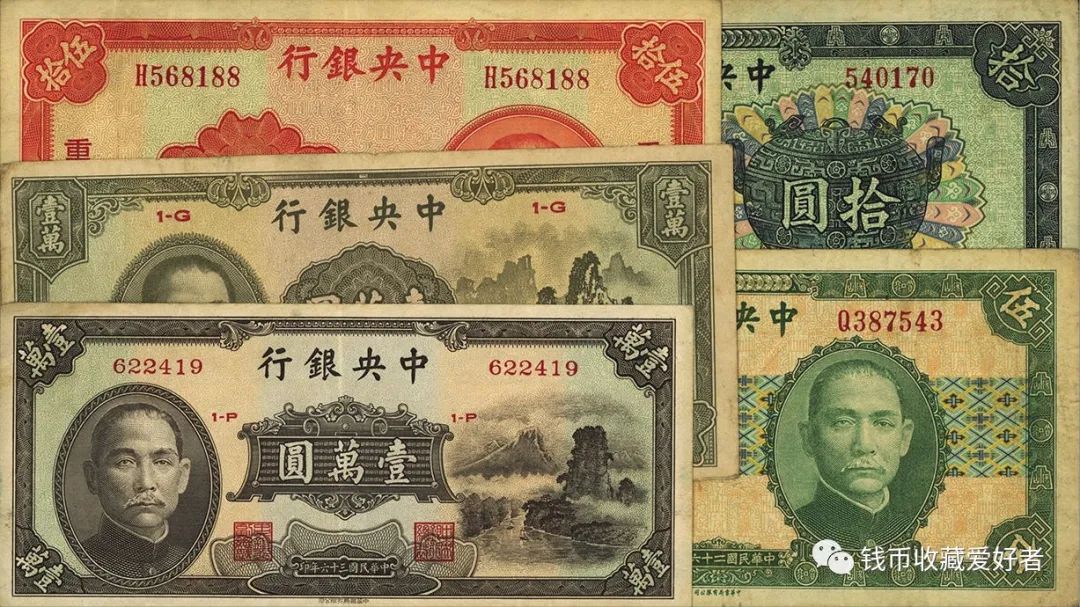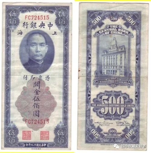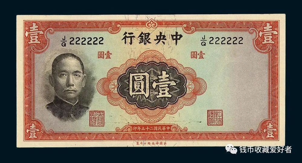 中央银行发行的法币纸币,币面上图案绝大部分以孙中山像为正面,以风景图为背面。其中有两种纸币比较特殊,即由美商保安公司印的五百圆和一千圆纸币上,直接印有“法币”二字。