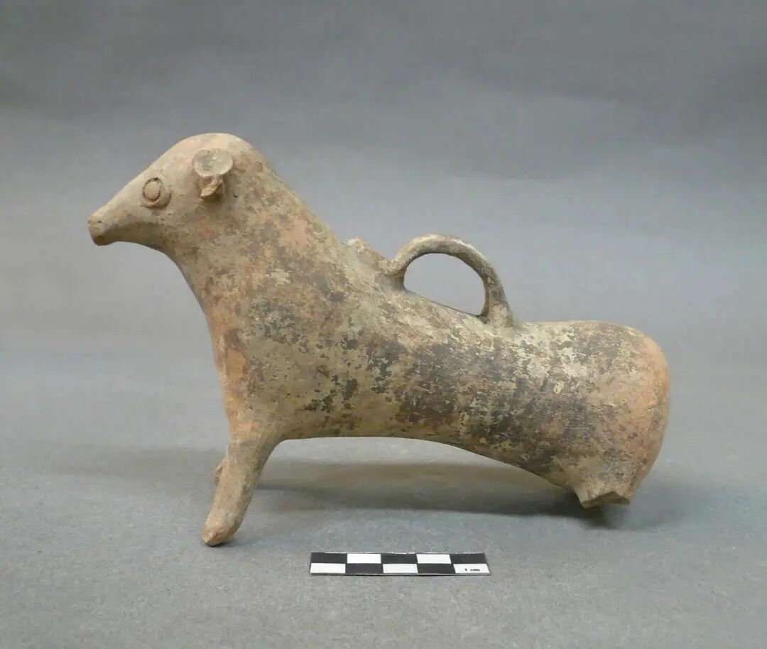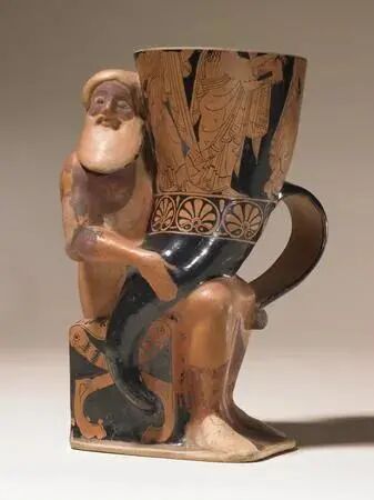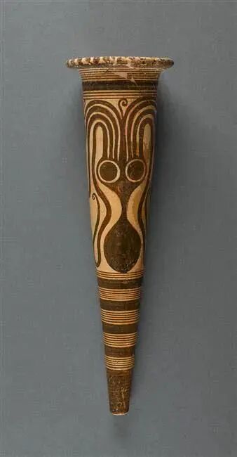 前两张图与我们传统印象里的杯子并不相同,这些来自赫梯与米诺斯的来通杯确实不是用来饮酒,而是用作另外一种用途—血祭,血液是生命与力量的载体,是神灵与人的区分,早期祭祀会将幼兽套上来通杯,牵到祭坛前对着颈部动脉进行最后一击,血液会通过来通杯喷溅到祭台上。至于为什么能喷溅出来,说实话我并不知道怎么做到,论喷溅功能来讲下面这个陶人应该不会输给任何人。