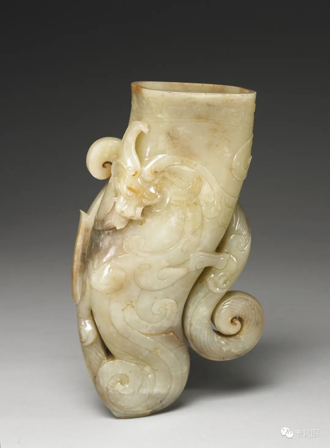 这种被称为“八棱兽首来通杯”,最早北齐就已经出现,风格受希腊神殿柱形来通杯关注公众号老货圈以及中西亚八棱金银器造型影响而成。还有一种舍弃了来通杯头部吐水的功能,直接从“兽首角形来通杯”变为“兽首执柄角杯”。