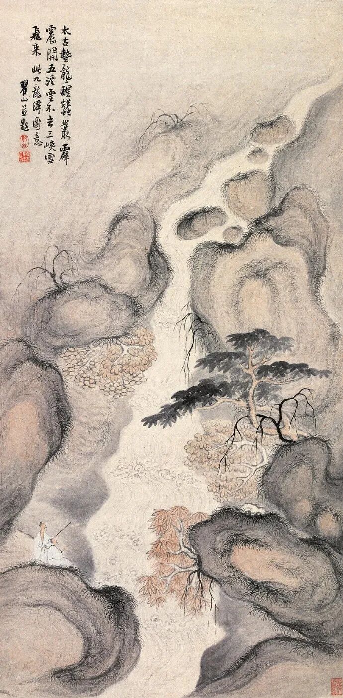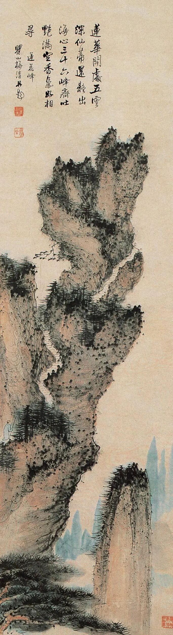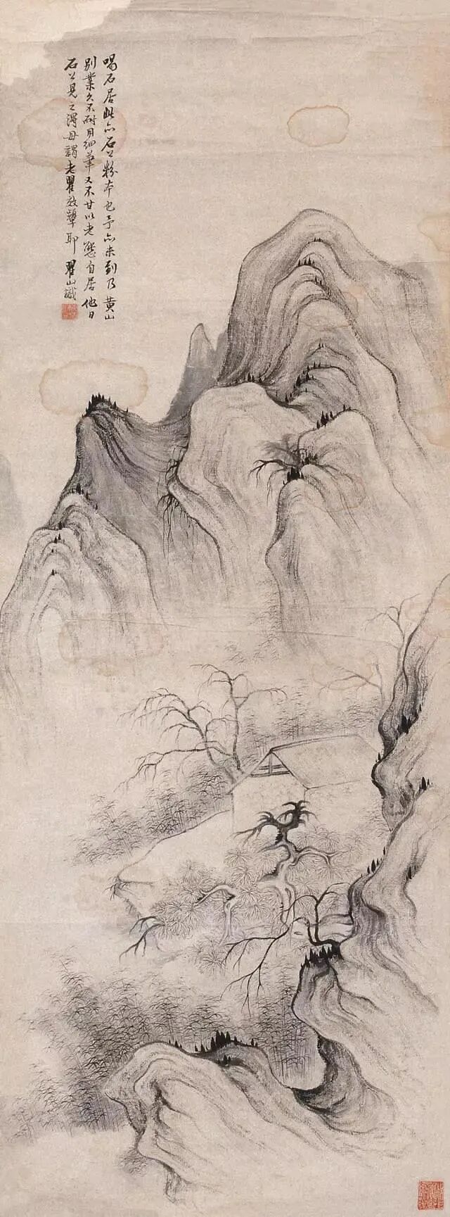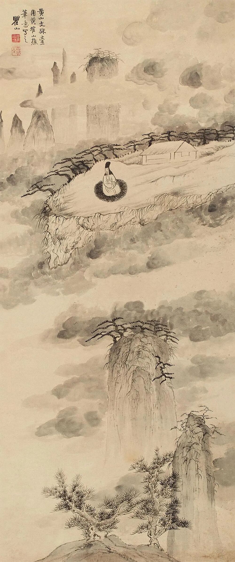 黄山地处安徽,山峦于晨暮阴晴间,景色变幻不定,在梅清简洁而洗炼的笔墨下,险峻山体活现,山峰古松连贯,山间云烟呼应。他用卷云皴表现云的不同形态,如行云、闲云、瀑布云等,给人苍茫如置身仙境的感觉!