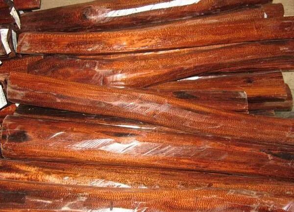 心边材区别明显,心材暗红褐色,边材宽,淡黄白色。胸径50cm的,心材18cm以下。胸径38cm的,心材仅2.5—10cm。心材独特的深色花纹部分是由树脂形成,极具装饰效果。光泽强,结构细,纹理直。