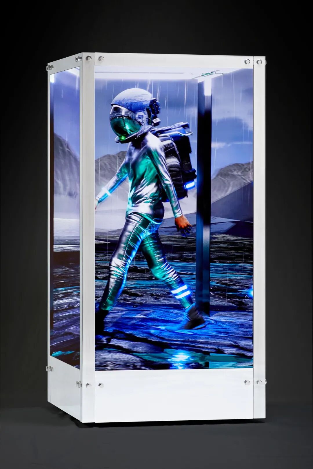 Beeple设计的单核心LED雕塑犹如魔术师的透明魔法箱,会应不同的日夜观赏体验,在四个相互连接的屏幕播放超过24小时的动态影片。雕塑超过 7 英尺高,底部连接电脑,让屏幕播放一位外形类似太空人的无名英雄影片——即戴着头盔的《人类一号》。影片中的主角无视永无尽头而又徒劳无功的薛西弗斯(Sisyphean)式命运,在这不断变化的反乌托邦风景中,有节奏地迈向前方。