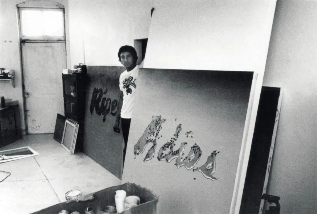 1967年,Jerry McMillan, 埃德鲁沙与画作《Ripe》及《Adios》在他的工作室。照片 Jerry McMillan. Courtesy of Jerry McMillan and Craig Krull Gallery, Santa Monica, California. 艺术品 Ed Ruscha.