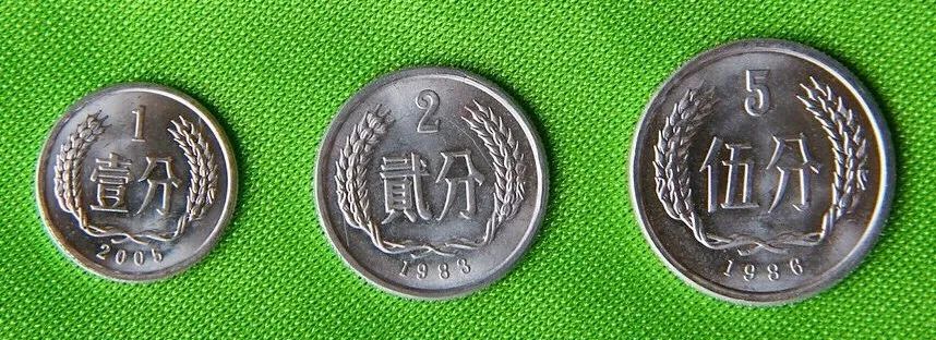 第一套硬币是在新中国成立初期1950年开始准备和研究,于1954年定稿,于1955年正式生产。第一套流通硬币有壹分、贰分、伍分三个品种,选用铝基合金。1955年至1956年前半年为铝铜合金,铜占0.5%,1956年6月后改用铝镁锰合金,于1981年选用含铝98.1%、含镁1.5%、含锰0.4%的合金。边部有丝齿,以增强防伪,在正面或背面有铸造年号(一般每年更换一次年号)。参与生产的主要有沈阳造币厂、上海造币厂、南京造币厂。