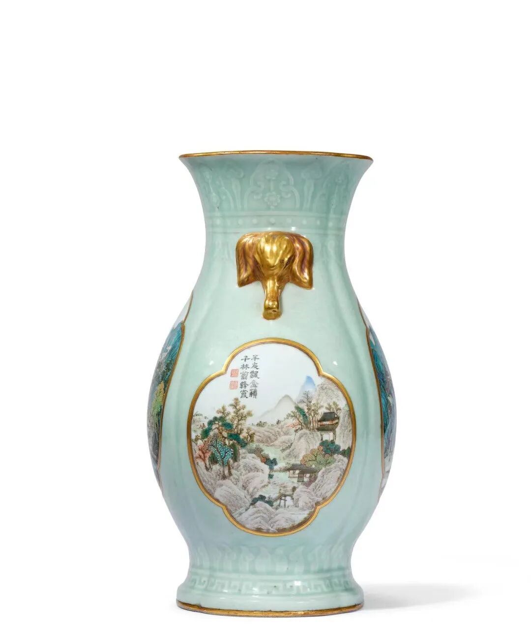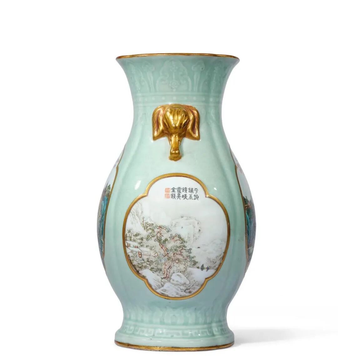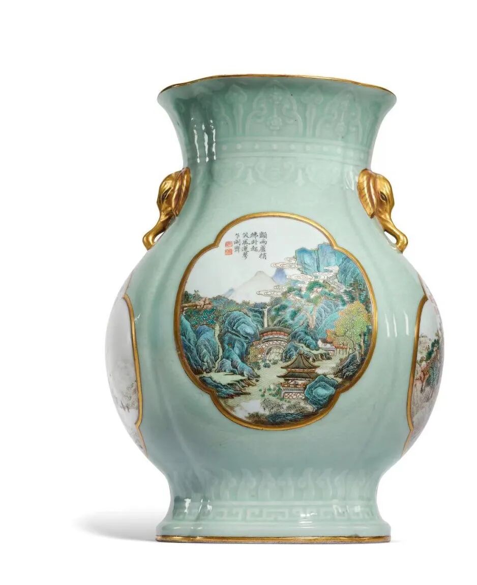 Lot0133清乾隆 御制诗洋彩冬青地四团山水象耳海棠罇