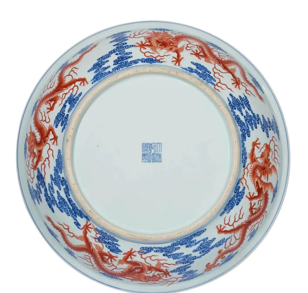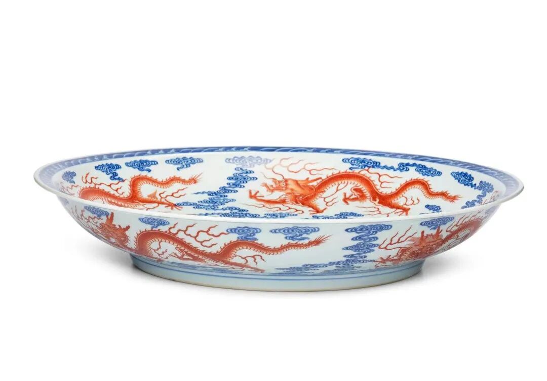 此拍品为乾隆官窑的代表性器物,盘折沿,浅弧壁,里外壁青花绘祥云、内底矾红绘一正面五爪海水龙升于蓝地白花海水上、内、外壁分别绘四条形态各异,或回首,或前行三爪行龙以组成「九龙图」,龙爪有三爪、五爪之别,龙尾有花尾、尖尾之别。明、清官窑瓷上,龙纹的正规式样为五爪,尖尾状,取奔腾向前的姿态。此盘所绘龙纹,笔画严谨,其纹饰也有变化,里口沿饰海水纹,圈足,盘底所罩白釉有小橘皮纹,底青花书「大清乾隆年制」篆书款。