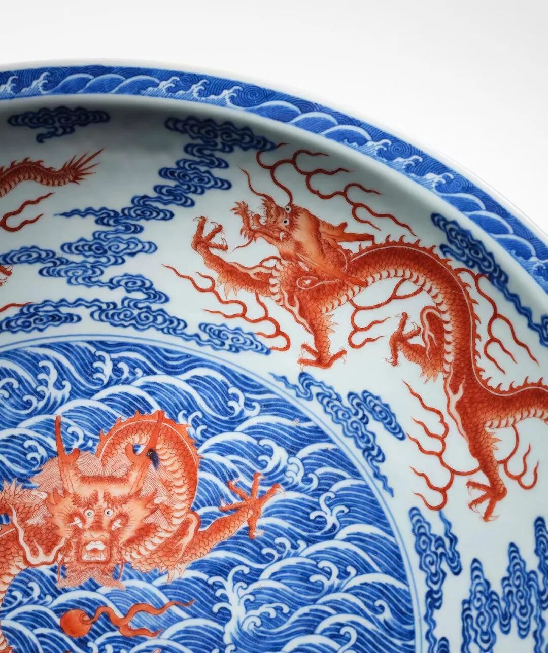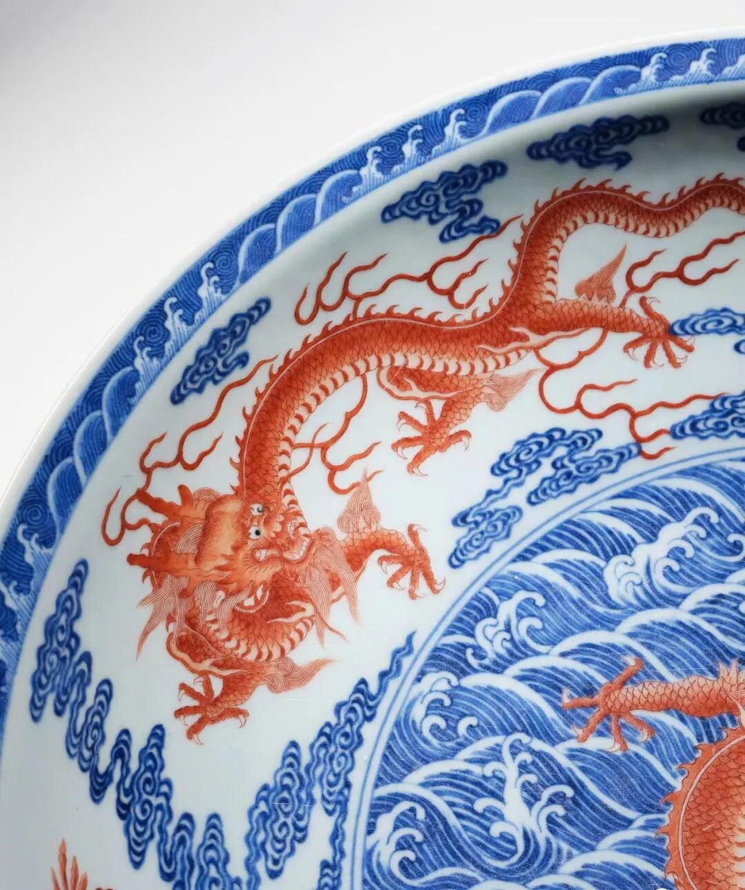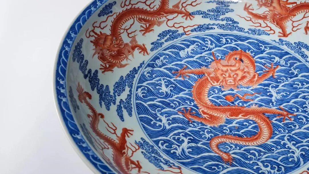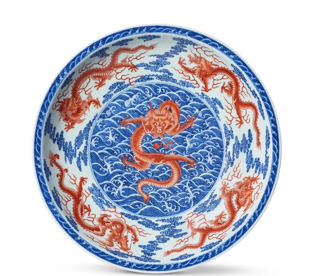 大盘器形规整,正面巨龙,跃现盘心,欲夺火珠,色取矾红,泳于钴青海水波涛,活灵活现。九龙图案雄伟,气势恢弘,展现了江西景德镇御窑厂在唐英等督陶官的管理下,兼顾完善生产技术及装饰仿古创新,达到在陶瓷史上的又一高峰之景。