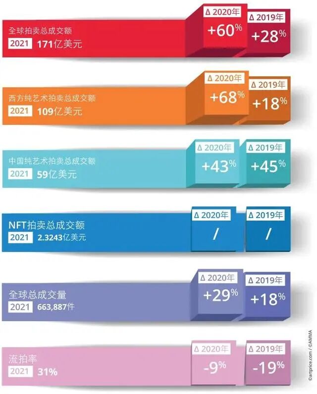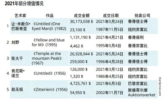 中国当代艺术家日渐成为全球关注的焦点,这背后反映了中国当代艺术市场的强势崛起。2021年全球艺术市场堪称史上成绩最优异的年份之一。全球范围内艺术作品总成交额超过170亿美元,同比增长60%,艺术品销售曾遭受第一波疫情以及随之而来的隔离措施的严重打击。拍卖活动尤为艰难:2020年拍卖会减少了10%,拍品总成交量也减少了10%左右,全球成交额更是下降了21%。不过这场危机却也加速了艺术市场的数字化转型,促进了拍卖行调整结构和拍品的质量。通过这些调查发现,藏家在竞标后收藏的艺术品大大奠定了日后这些当代艺术家通往市场上的另一扇窗,许多中国当代艺术家作品俨然成为艺术投资的新风向。根据研究发现,在去年的艺术市场的蓬勃之势还体现在价格水平坚挺以及创纪录的成交数量。热情的竞拍者共拍走了66.4万件拍品,几乎比去年多三分之一,与20年前相比增幅达161%。拍卖会数字化转型因疫情而提速,成为促进交易增长的根本动力:拍卖会通过网上展示拍品实现了彻底的全球化,从而不断斩获新的粉丝。中国艺术市场惊喜不断。与西方市场相反,中国市场在前一年就表现出逆势上扬(微增2%),尽管成交数量因疫情暴跌40%。富裕的中国买家受疫情影响甚微,在2020年下半年创造了多个重量级的古典作品和现代作品成交记录。今年更是轻松实现增长,成交额上涨43%,达59亿美元,成功超越美国(57亿美元),尽管成交量更少。根据数据显示在2021年的部分增值情况中,刘野以当代艺术家为首,其作品成为去年最具高度增值的艺术品。中国香港见证了全年最耀眼的艺术品增值。来自于中国艺术家张大千和刘野以及美国艺术家巴斯奇亚的作品。