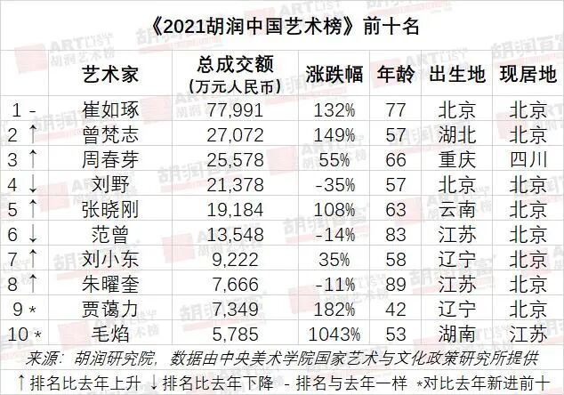 国画家崔如琢以7.8亿元的总成交额再次荣登胡润中国艺术榜榜首,至此崔如琢连续7年荣膺榜首。其2017年作《秋山烟翠》成为在世艺术家去年成交价第一高的作品,由永乐拍卖以1.9亿元的价格拍出。崔如琢在2020年的总成交额与上一年相比出现大幅增长,增加了4.4亿元,增幅132%,高出第二名成交额5.1亿元。胡润表示:“崔如琢这七年公开拍卖市场作品总成交额共计达到51.1亿元,是第二名曾梵志的四倍。”
