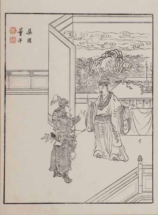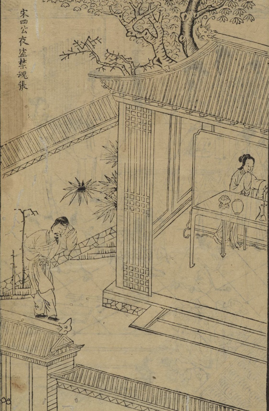 懒龙走在指挥书房屋脊上,挖开椽子,溜将下来。只见衣架上有一件沉香潞绸披风,几上有一顶华阳巾,壁上挂一盏小行灯,上写着“苏州卫堂”四字。懒龙心思有计,登时把衣巾来穿戴了,袖中拿出火种,吹起烛煤,点了行灯,提在手里,装着老张指挥,声音步履,仪容气度,无一不像。走到中堂壁门边,把门騞然开了。远远放下行灯,踱出廊檐下来。此时月色朦胧,天光昏惨,两个军人大盹小盹,方在困倦之际。懒龙轻轻剔他一下道:“天色渐明,不必守了,出去罢。”一头说,一头伸手去提了鹦哥锁镫,望中门里面摇摆了进去。