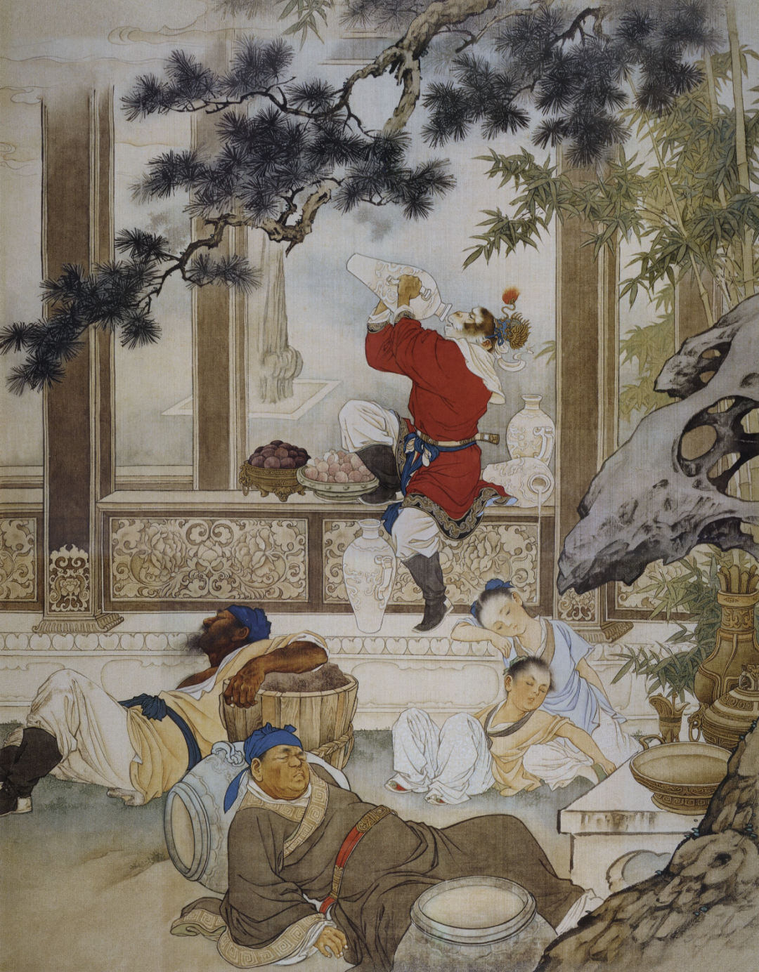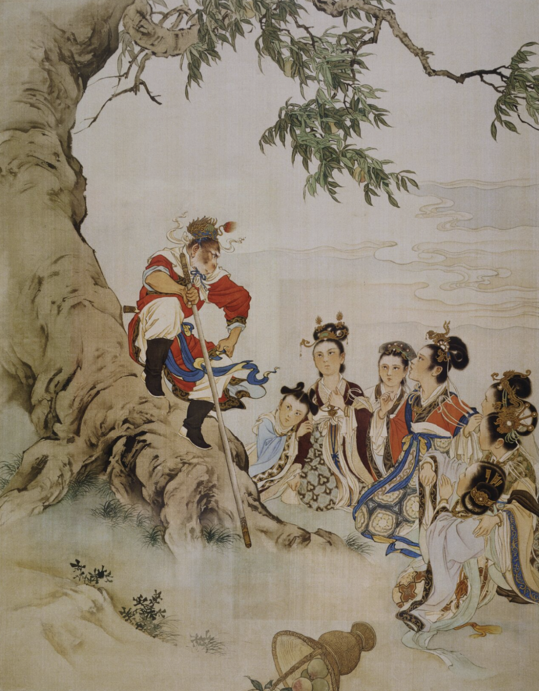 有趣的是这里的几条罪状都离不开一个“偷”字。孙悟空的造反固然都是凭藉了他超凡的武功,可是却并没有杀进天宫,真正搅乱了天宫的不是他的武力,而是他神偷的伎俩和灵巧善变的手段。由此也不难见出,所谓大闹天宫,无非就是这样大闹一场罢了,既没有丝毫动摇天宫的统治,也没有任何政治目的,或什么安排与计划,一路上只是走到哪就偷到哪,而孙悟空偷吃了老君金丹酒醒之后,甚至还吓了自己一大跳,这哪里像是要取代玉皇大帝的样子呢?就是在他做了齐天大圣以后,孙悟空也还是没有任何目的地闲逛,不知做些什么才好。以致终于不过是做了个看桃园的人,却也自得其乐。只是如果有谁小看了他,或轻视了他,那就忍不住要显显手段,大闹一场,如此而已。