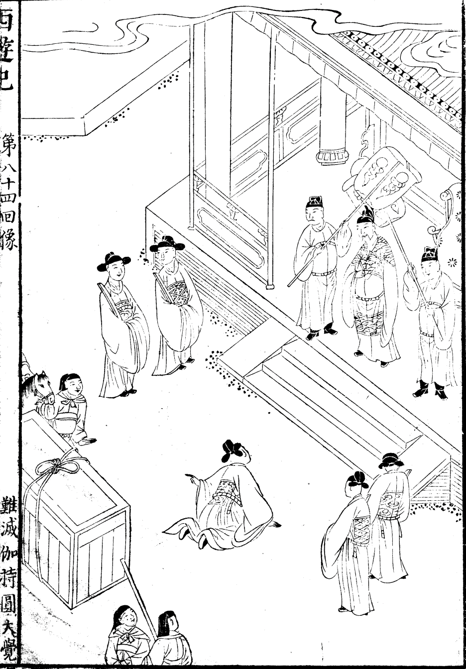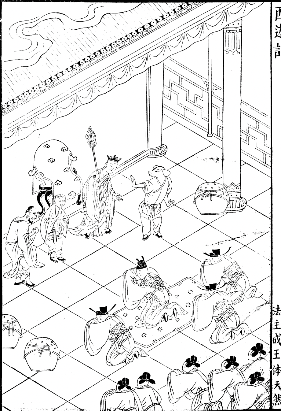 而孙悟空偷得衣服,混进灭法国以后也正做了同样的一件事情。那灭法国的国王发誓要杀一万个和尚,唬得唐僧一行只得扮作俗人,睡在一家客店的大柜子里,可是不曾想半夜里柜子被强盗盗去,又被官军夺下,准备送将官府处置。这时睡在柜子里的孙悟空使了个手段,钻出柜子,连夜混进官府,将所有的宫女太监,连同着皇后和国王一并都剃作了和尚模样,于是,灭法国一夜之间变成了和尚国。次日清晨:
