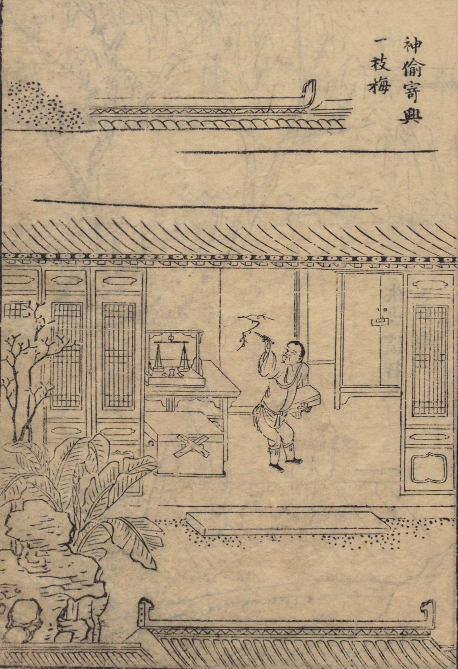 可见孙悟空的偷盗手段之高,不仅远近闻名,而且令人生畏。连太上老君也不敢不送他一丸仙丹,以求息事宁人。而同样的事情也发生在《神偷寄兴一枝梅》中,神偷懒龙潜入无锡的宫舍,盗走金银,也照例在墙上留下一枝梅的标记。小说接下来是这样写的: