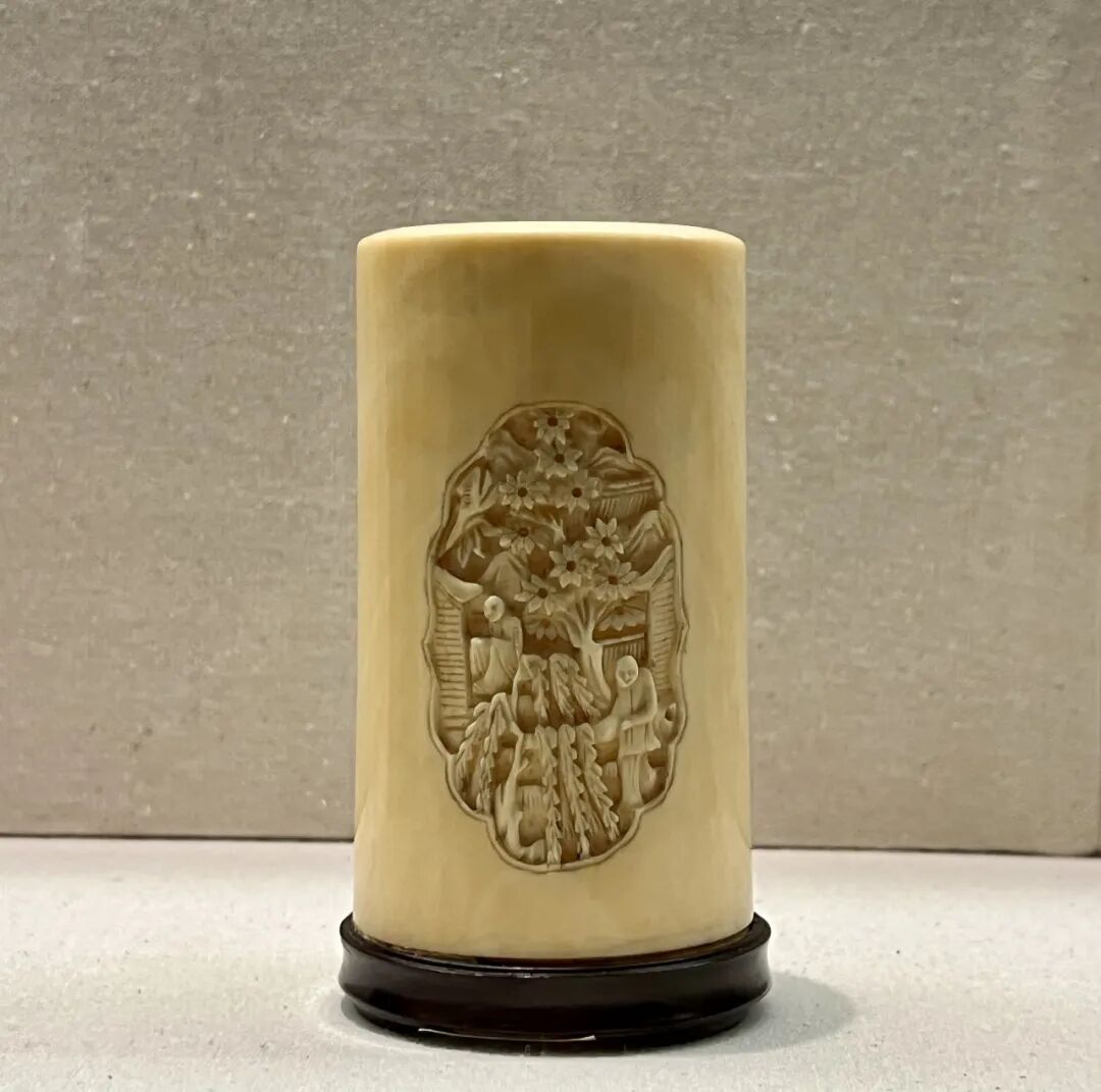 细心的朋友可能会发现,在杭博北馆三楼闲情雅致展厅内,也展出了一件象牙笔筒。两件象牙笔筒之间是不是有些许共通之处呢?
