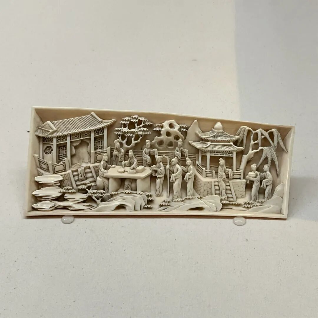 这件深浮雕庭院人物象牙信插,是典型的西式用品,采用壁挂式,上部留孔便于悬挂。横格倾斜呈阶梯状,中空处用于放置信件。器身满雕亭台、渔舟往来和市井生活等不同主题的中国庭院人物纹饰,并装饰西方洛可可花卉纹样。信插整体的视觉构图是西方的,但图像的内容却是中国的,这是外销艺术中十分常见的“混搭”风格,再现了西方社会对于东方生活的美好想象。