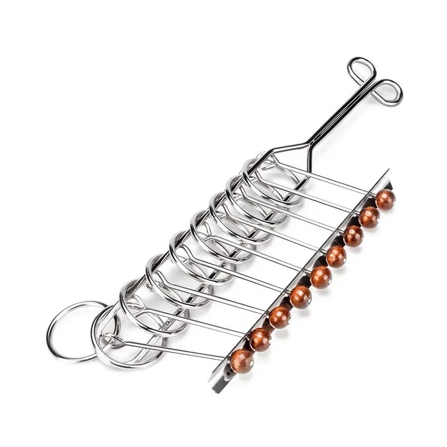 九连环也是我们中国传统民间智力玩具,它以金属丝制成9个圆环,将圆环套装在横板或各式框架上,并贯以环柄。按照一定的程序反复操作,可使9个圆环分别解开,或合二为一。