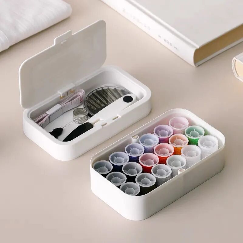 此针线盒呈长方形,通体雕人物、亭台楼阁图案。盒内分若干层格,用来放置顶针、绕线板、针垫等象牙制针线工具。整盒雕刻精细,造型精致,极具广州象牙雕刻的特点。