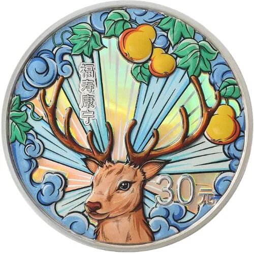 银币背面整版的色彩运用十分丰富,神鹿光芒万丈照耀四方。这么大面积的色彩运用,在我国的纪念币中极其少见。