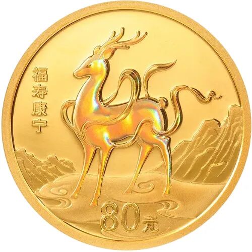 今年的吉祥文化纪念币,对于色彩的应用非常大胆。尤其是福寿康宁这一组,金币的“九色鹿”运用了光变麟彩工艺,似乎有种带着镭射的光芒!