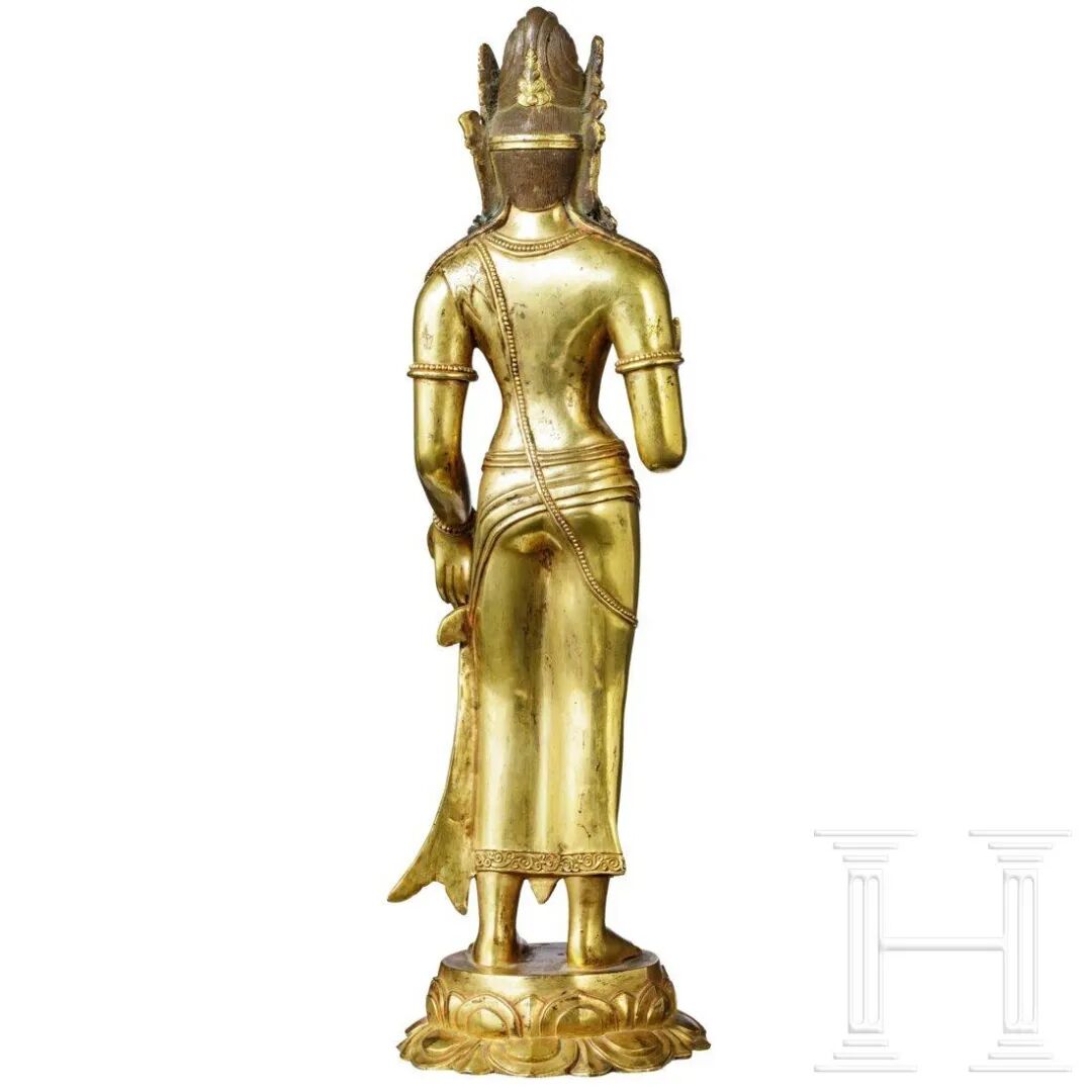 北京时间5月16日下午4点,Hermann Historica 将在慕尼黑举行『亚洲艺术和俄罗斯艺术』拍卖会,带来近900件古董艺术品,囊括瓷器、玉器、书画、宗教艺术、俄罗斯艺术、欧洲雕塑及工艺品等多个门类。当中,一系列精美中国瓷器尤为亮眼,题材、纹饰、器型各具特色,又以粉彩百鹿图盘口瓶(Lot 158)和青花笔筒(Lot 129)最具代表性,展现了中国传统工艺之匠心与巧思。本次拍卖,联拍在线将全程直播,并提供实时同步竞拍技术和服务支持,助您足不出户,畅拍全球。Lot 230 18至19世纪 蒙古 扎那巴扎尔风格 鎏金观音铜像