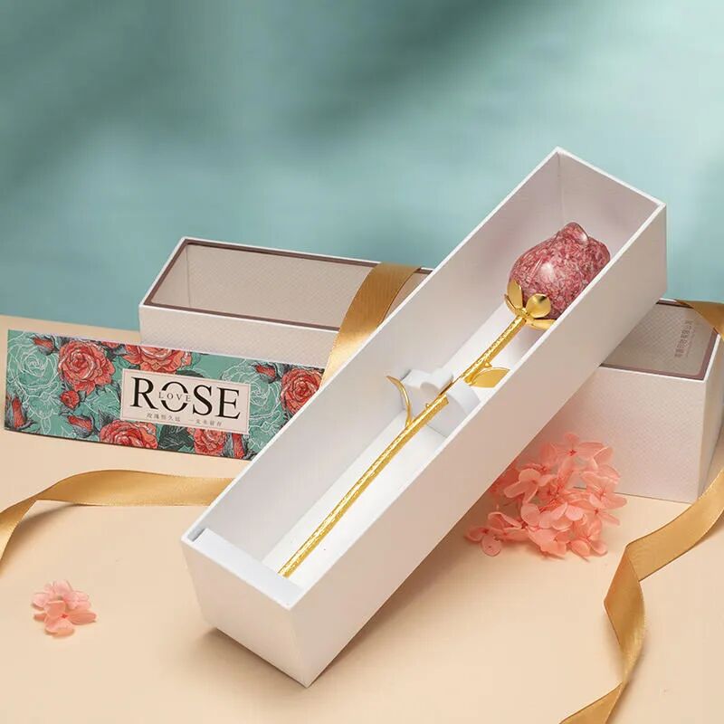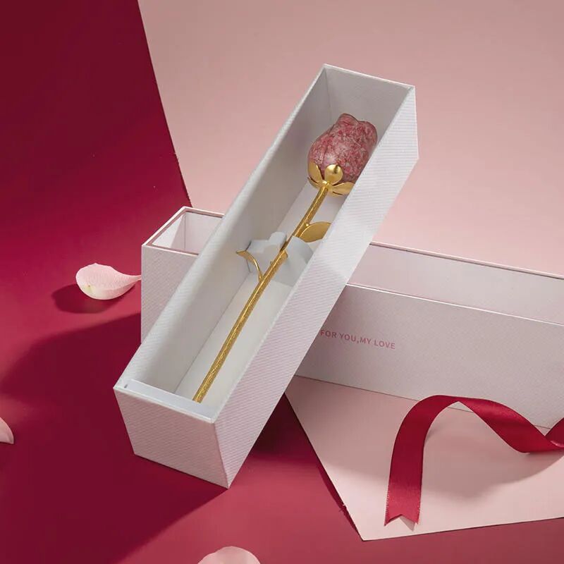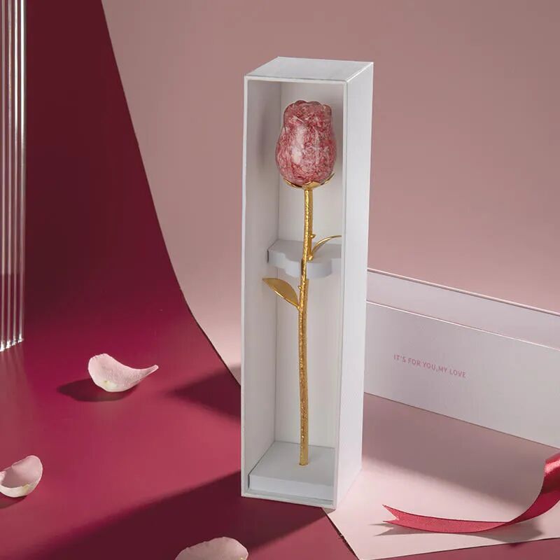 镀金花枝长21.13cm,寓意爱你、一生;花蒂为罕见的五瓣丁香,寓意遇见你是我的幸运。