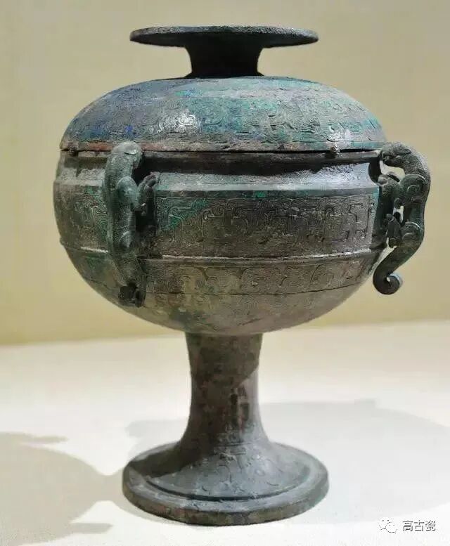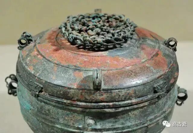 又是一件令人震撼的艺术极品。这件酒容器是代表中国青铜时代晚期的铸造艺术高超水平。表面装饰的图案非常复杂,盖子上的三个横卧动物的设置也许是中原地区与中亚和北亚游牧文化的接触的结果。这个青铜器表面的一部分一直保存在其原始状态,维持着金色的美妙光泽。