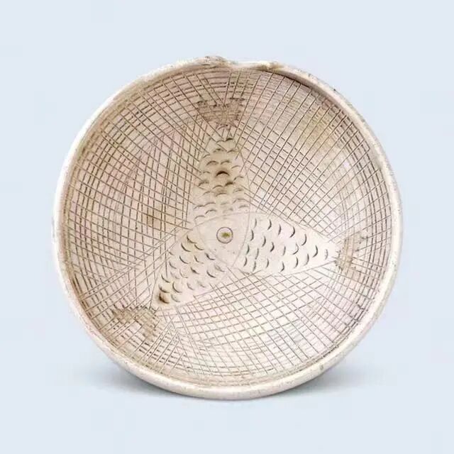 唐伊始屡见,如安徽省六安市椿树镇唐乾符三年(876)卢公夫人墓中出土的一件邢窑白瓷三鱼纹擂钵网纹中间刻共首的三鱼纹。有研究者认为:此器刻纹较深,齿如锉刀,应为“擂钵”。唐代中后期,饮茶之风盛行,此钵精细,可能为研茶之用。