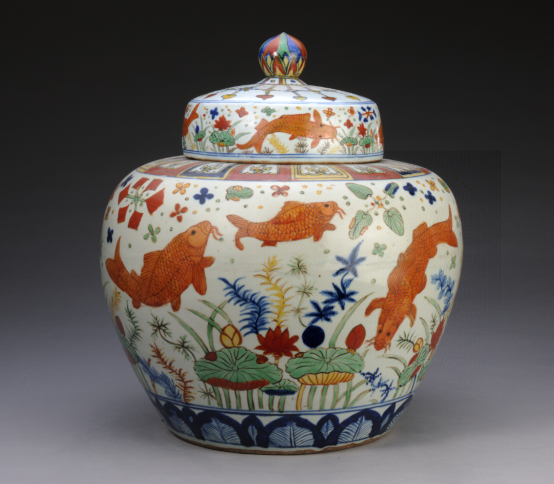 ▲明 嘉靖款五彩鱼藻纹盖罐 故宫博物院藏