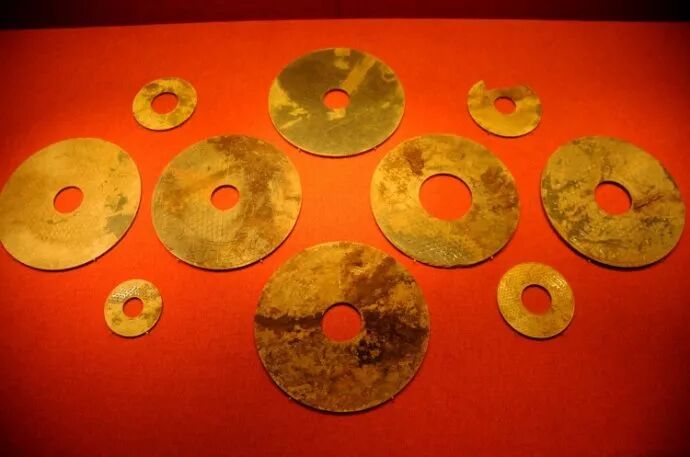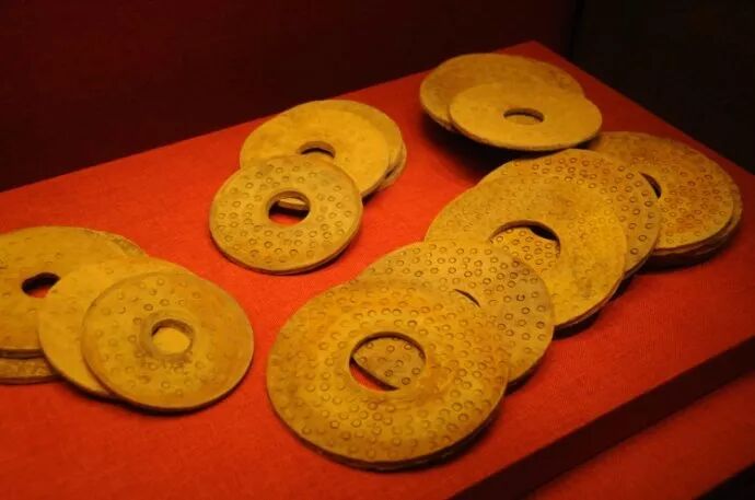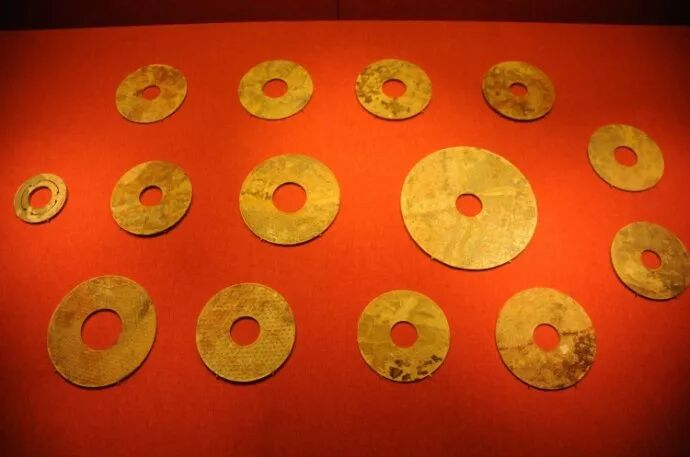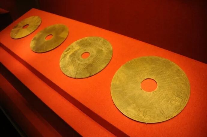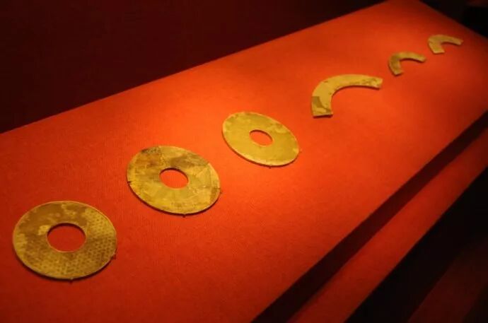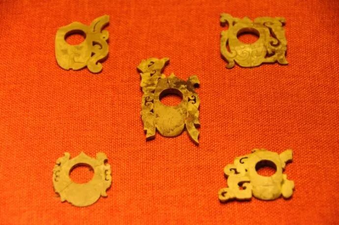 在玉衣的下面摆放有5块玉璧。璧的表面还留有丝带绕过璧孔的痕迹,说明5块璧原是用丝带系在一起的。玉衣的手套一端,是一对造型各异的龙形玉握。在考古学上,所谓握,就是以物放在死者手中,使之握。