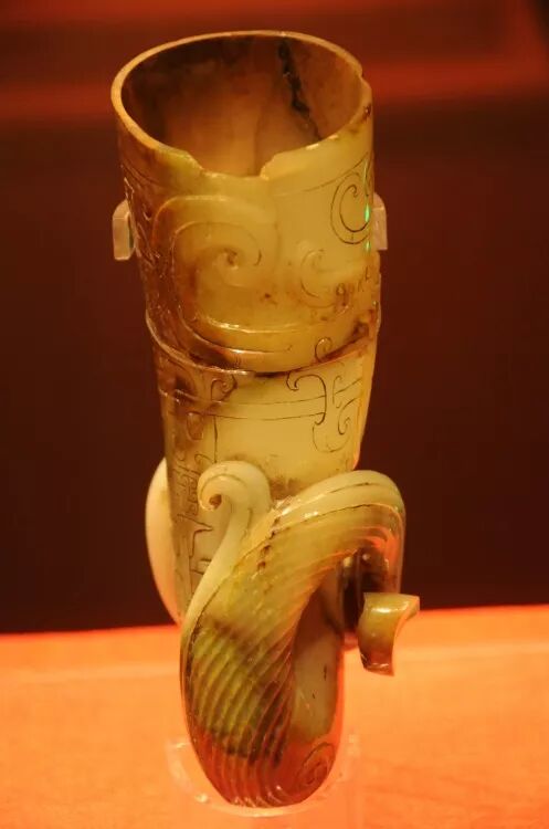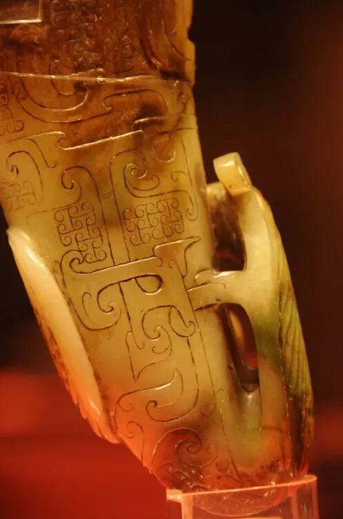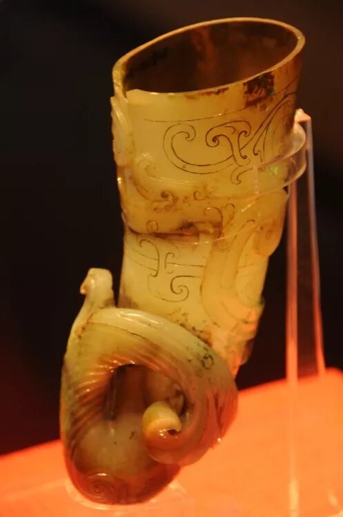 相传犀牛角的酒杯可以溶解毒物,玉虽不能解毒,南越国的玉匠却借题发挥,就着石头的形状施刀,综合运用玉雕的各种工艺方法,在器身上巧妙布局各层纹饰,再经过细致的打磨,二千年后玉角杯仍放射出温和恬润的光泽。