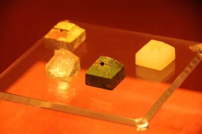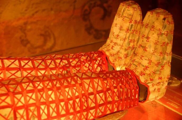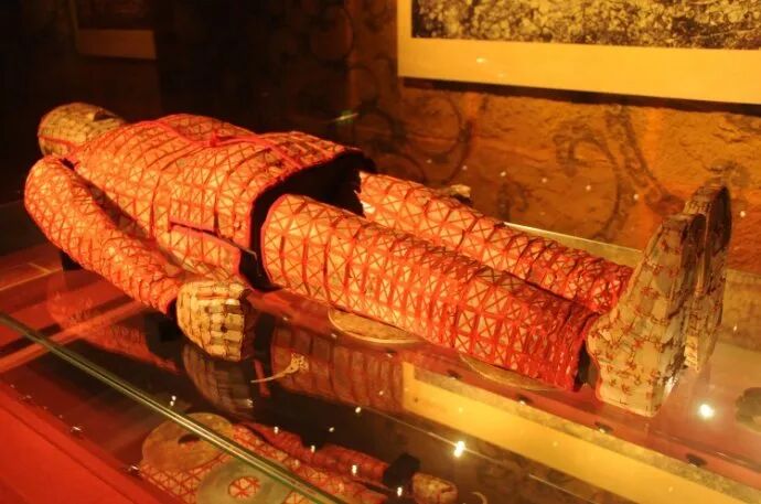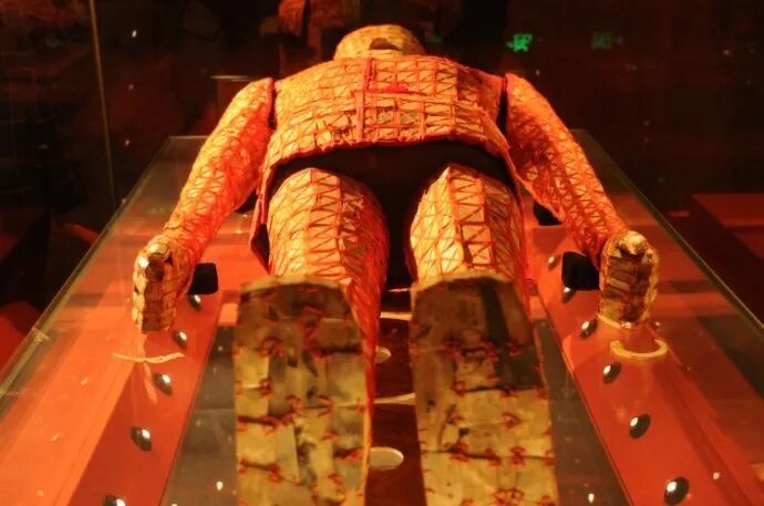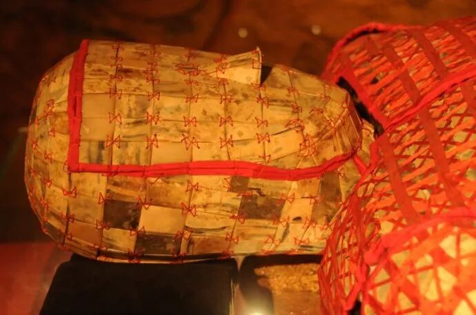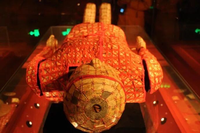 南越王的丝缕玉衣,长1.73米,共用了2291片玉,用丝线穿系和麻布粘贴编缀做成。分为:头套、上身衣、左右袖筒、左右手套、左右裤筒和左右脚套共十部分。玉片以长方形和方形为主,还有梯形、三角形、五边形等。头套、手套和鞋子是用红色丝线穿缀边角钻孔、打磨光滑的玉片做成,里面以丝绢衬贴加固。玉衣躯干部分大多利用废旧玉器或边角玉料切成小玉片,贴在麻布衬里上,再用红色丝带在表面对角粘帖,十分规整鲜艳。
