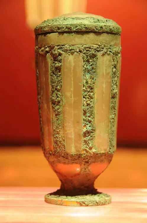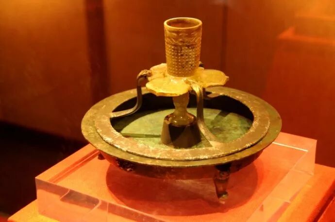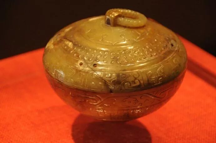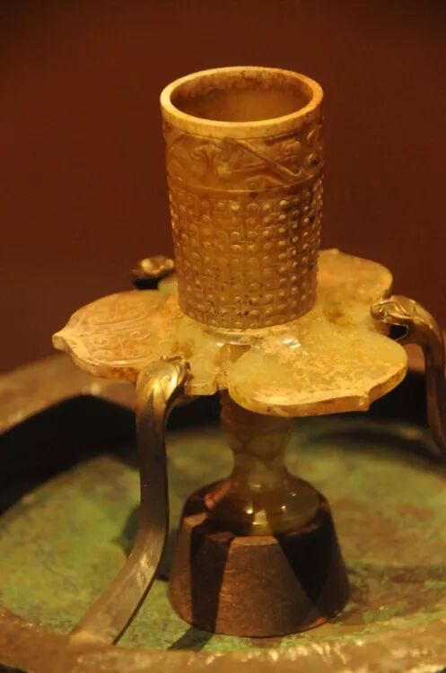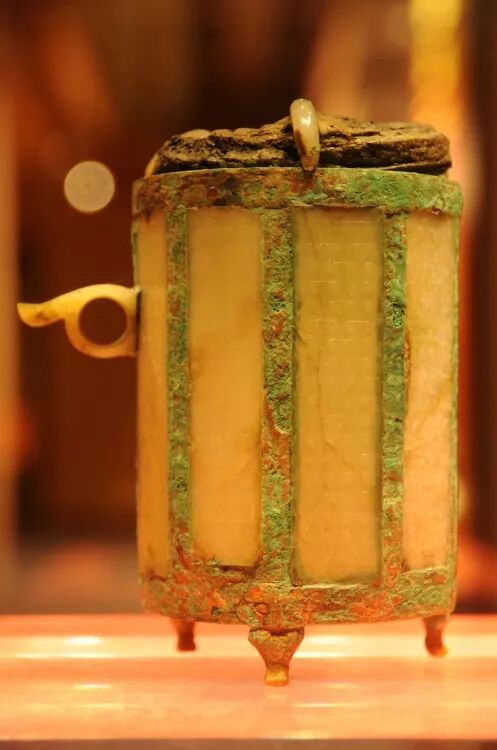 铜框玉卮是一件运用镶嵌工艺的实用玉器,用来饮酒,也是一件工艺品。它由9块青玉片嵌在一个铜框上制成,跟卮相配的有一个漆木盖,盖上的黑漆大部分已朽落掉。出土时,铜框玉卮上裹了很多层丝绸,可见当时就是一件珍罕之物。