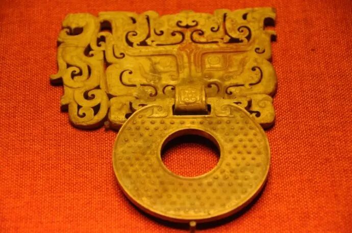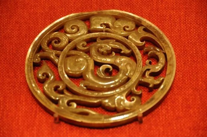 是一件装饰玉器,堪称国宝。它出土于墓主右眼位置,青白玉雕成,土沁呈黄白色。在设计上,玉佩分为内外两圈,内圈透雕一条游龙,外圈透雕一只凤鸟,站在龙的前爪之上。龙尾和后爪伸向外圈,凤冠和尾羽上下延成卷云纹,把外圈空间填满。凤鸟回眸凝望游龙,龙凤似喃喃细语,妙韵天成。龙凤相对,寓意吉祥。