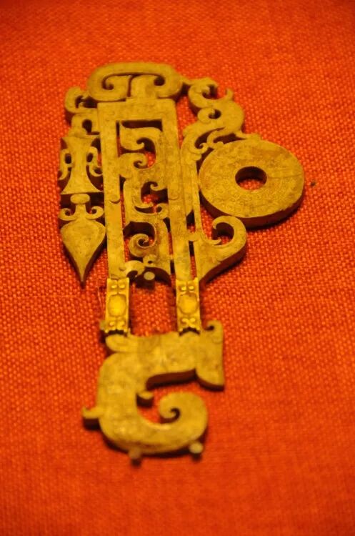 此件玉带钩跟前一件玉佩,据我的猜想,恐怕不仅仅是工艺上的风格独特,也许还有政治上的寓意。南越国是秦朝末年,趁秦失其鹿,中原混战之时,南海郡尉赵佗割据边塞,自立为王的,直到汉初,刘氏王朝还没有实力一举收服南越国,赵家也未必没有染指中原的野心(赵眜号文帝,有僭称皇帝的心思,墓中出土有“文帝行玺”的龙钮金印),所以虎噬龙佩、龙虎争环或者也是表达南越国政治野心的全豹一斑。