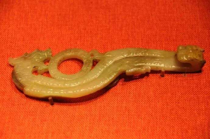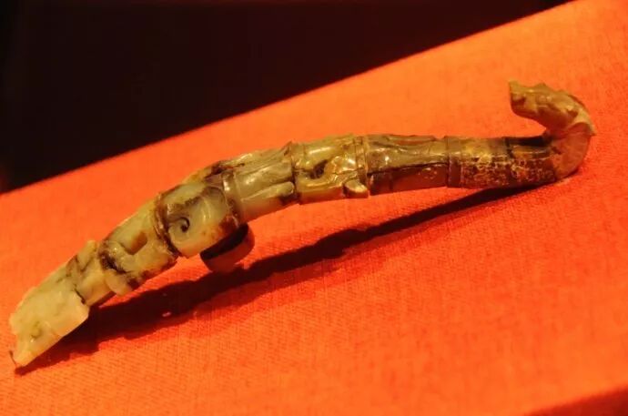 金钩扣玉龙出土于南越王的右肩部位,整体由一条青玉雕刻的玉龙和一个金质的虎头带钩组合而成,形成一幅龙虎争斗的生动图景。