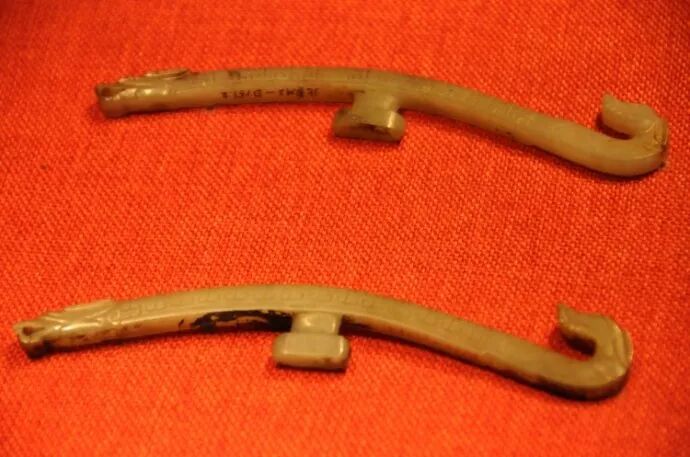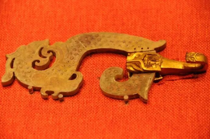 玉龙长身体弯曲成S形,回首张口,衔住背鳍,尾巴回卷,下半端折断,断口两边各钻有3个小圆孔。金带钩是铸成的,器表打磨光洁,钩尾和钩首都作虎头形。钩尾的虎头双眉上扬,额顶铸出一个字的“王”字,非常形象。虎口形成的套銎,刚好套住玉龙的折断处。把龙、虎两神灵动物巧妙地用不同材料做成一件器。