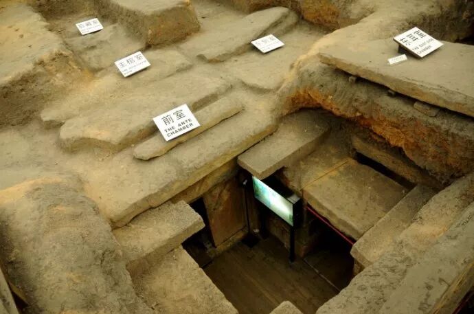 南越王墓劈山为陵,从象岗顶劈开石山20米,凿出一个平面“凸”字形的竖穴,再从前端东、西侧开横洞成耳室,南面开辟斜坡墓道。墓室以红砂岩石仿照前堂后寝的形制砌成地宫,墓顶用24块大石覆盖,再分层夯实而成。墓室仿照生前宅居筑成,墓室坐北朝南,前三后四共7室,宽12.5米,长10.85米。墓主居后部中室,前厅后库,前部东西为耳室,后部东西为侧室。殉葬者共15人,其中姬妾4人,仆役7人。