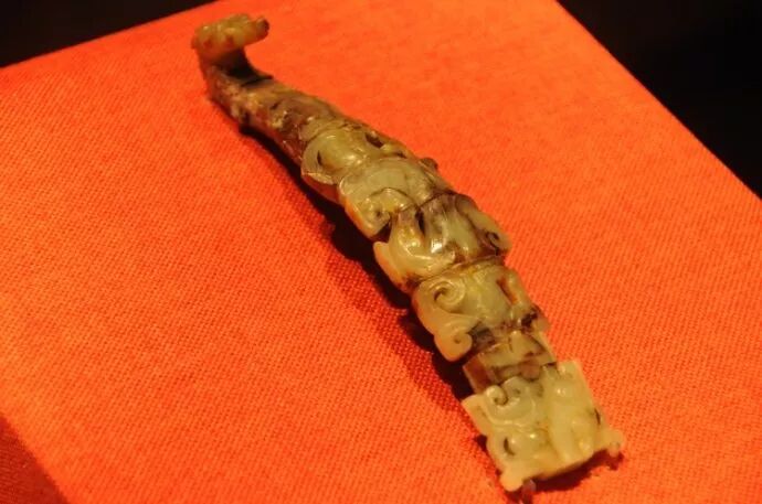 八节铁芯玉带钩出土自墓主人棺椁的头箱,所谓带钩,顾名思义就是古人束衣带的钩。这件带钩19.5厘米,重197.5克。由一根铁柱穿连8块玉而成。钩首为龙头,瘦瘦长长。钩尾为虎头,用一块玉细致地雕刻出老虎的凸眼、直鼻、獠牙、胡须、浓眉。钩身刻有鳞和鳍,和缭绕的云纹。