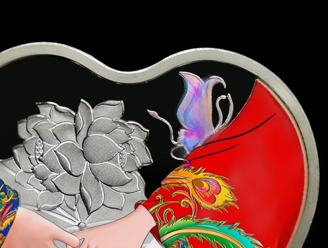 银章上的红蓝衣袖采用彩印工艺,热烈又喜庆。