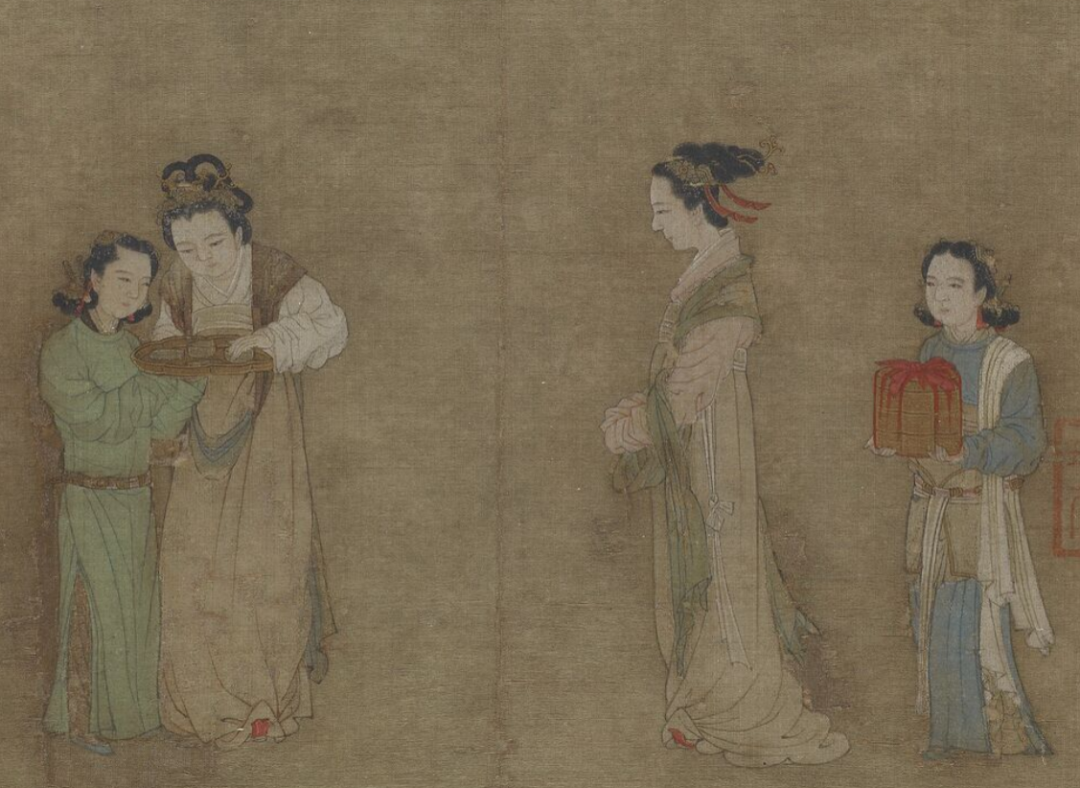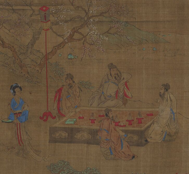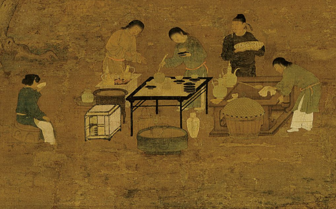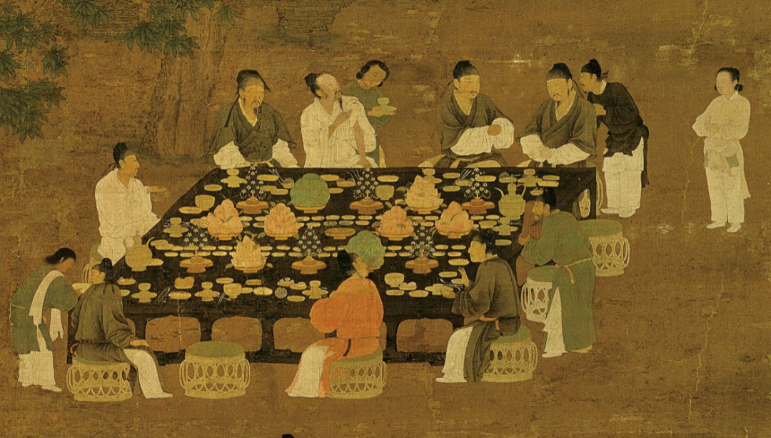 五代顾闳中所绘《韩熙载夜宴图》主人客人面前案上所列的食物不过八品,四个高足的浅碗,四个小碟子。