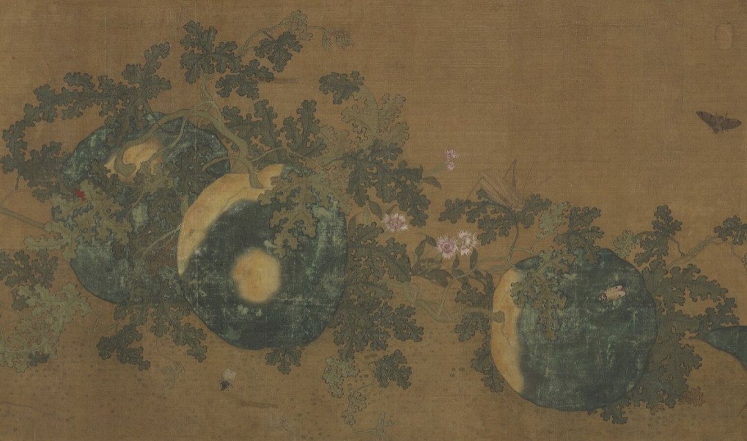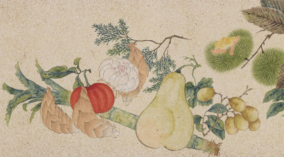 有一碗颜色是鲜红的,很惹眼,用放大镜细看,不过是几个带蒂的柿子!其余的看不清是什么。