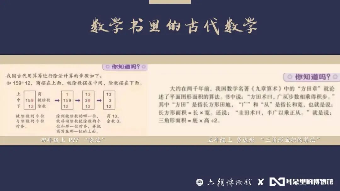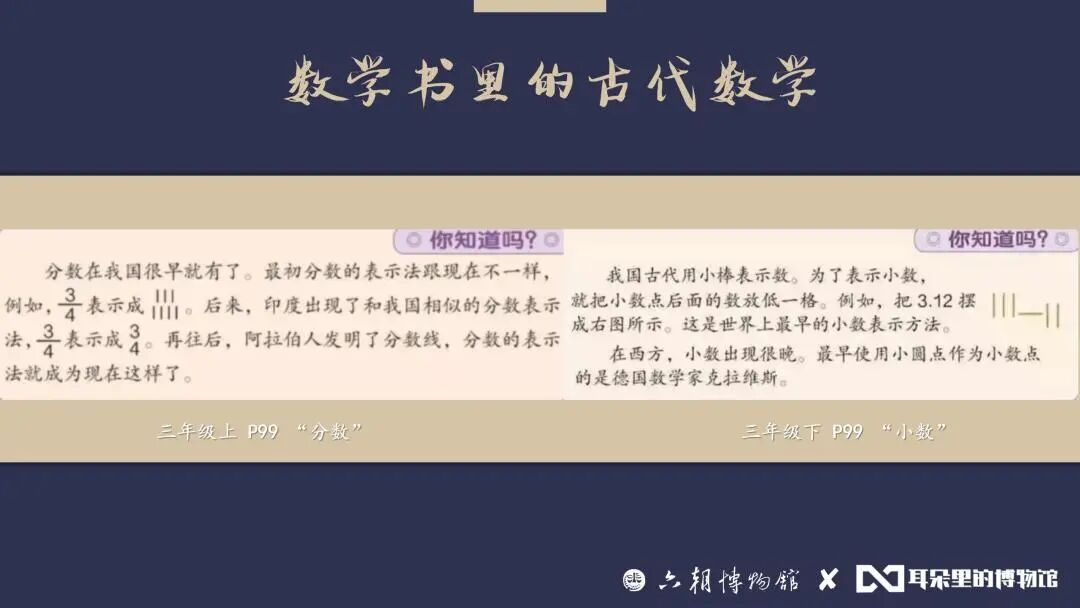 课后啊,你们可以再去翻翻以前的数学书,除了“九九歌”,书里还拓展了古代的“小数”“分数”“除法”,甚至是“三角形面积的算法”,非常丰富~在以后的学习中,你们要慢慢地把这些知识,都串起来,这样,就能更系统地认识古代数学了。