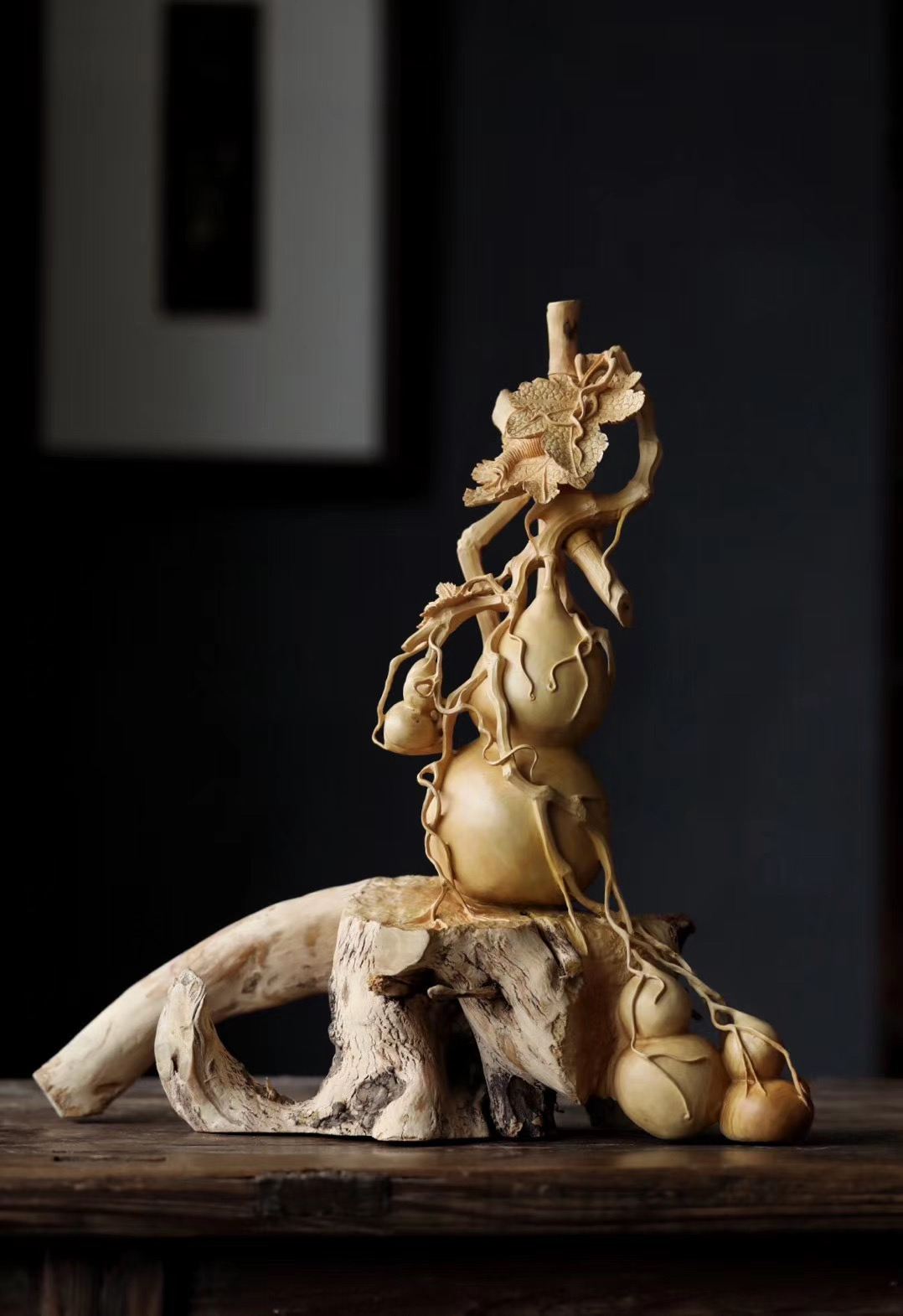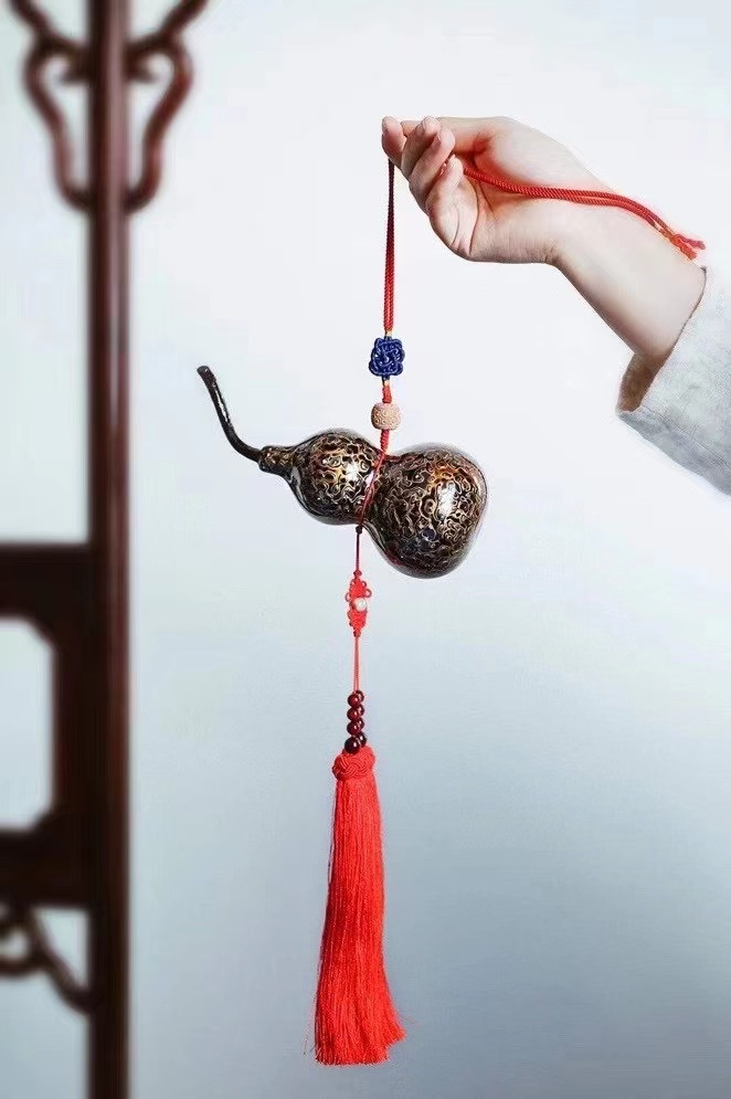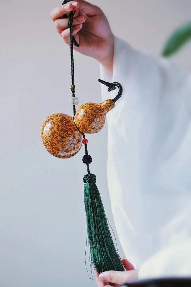 葫芦工艺品之所以受到人们的钟爱,是因为它有多变的造型和精湛工艺。经过加工之后的天然葫芦,表面可以产生繁复的图案,而且可以通过改变葫芦的形态,来达到一种奇妙的艺术美感。