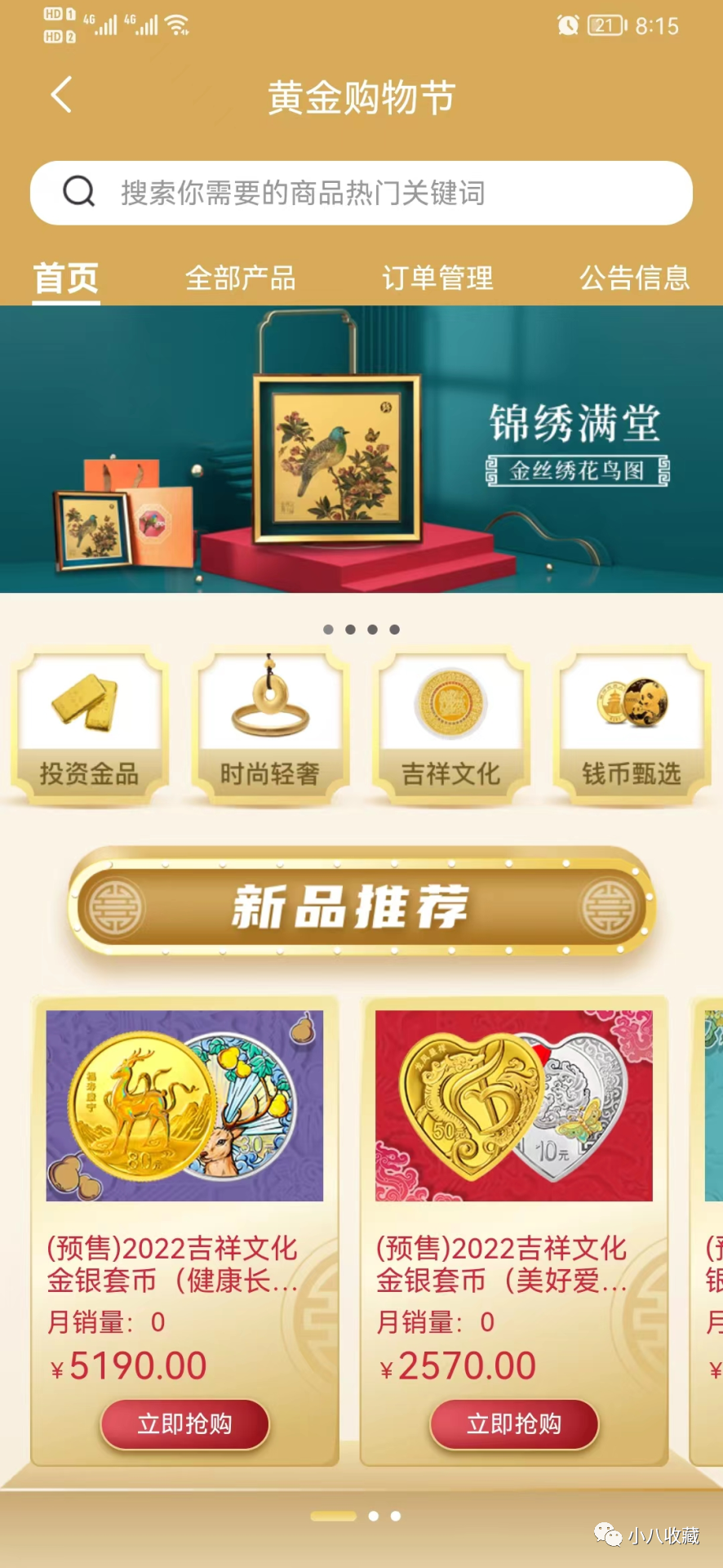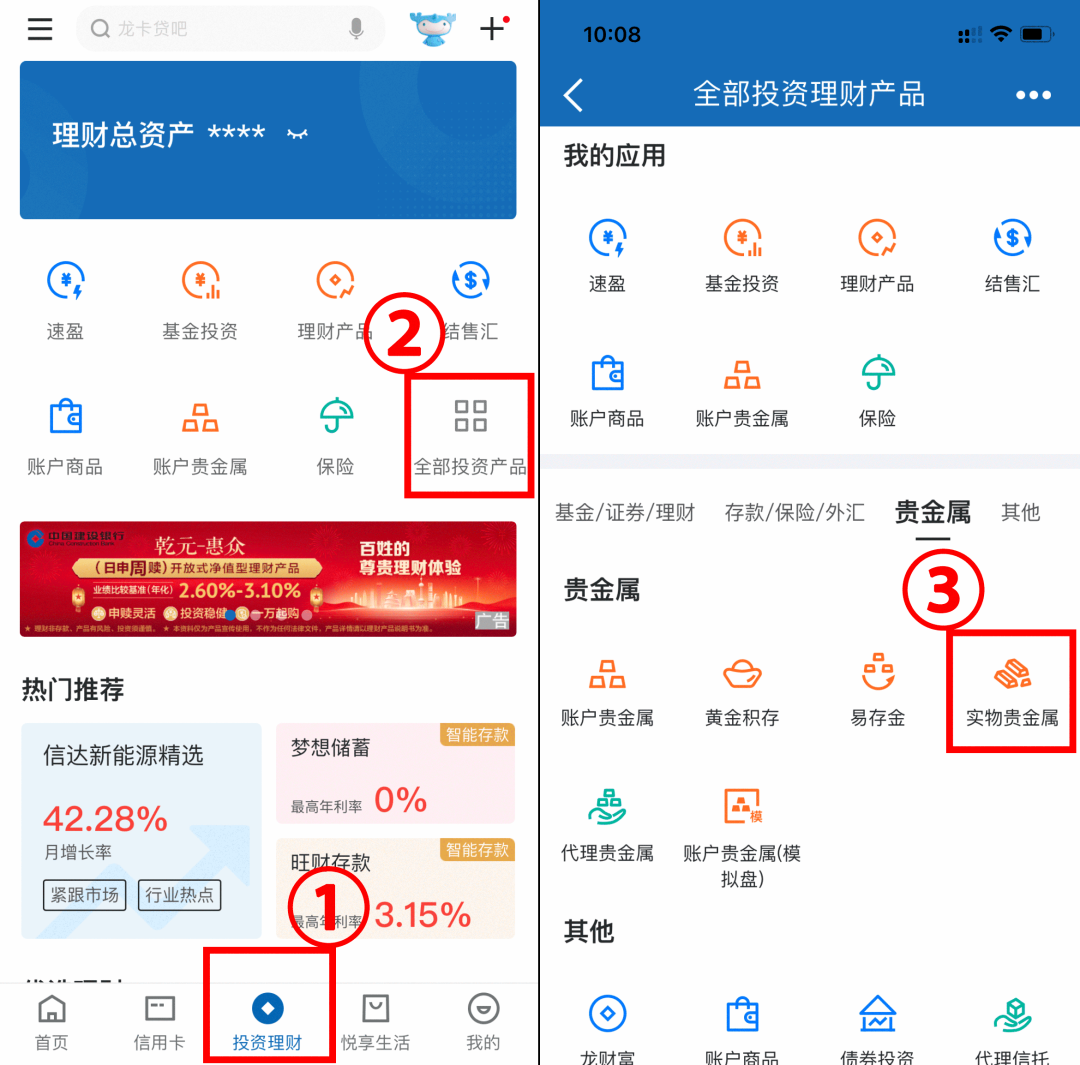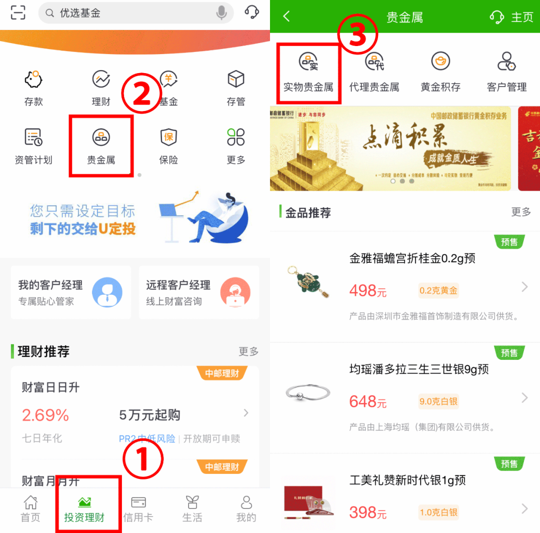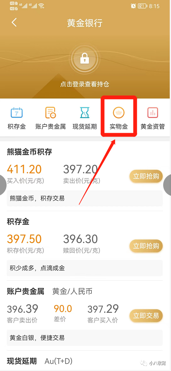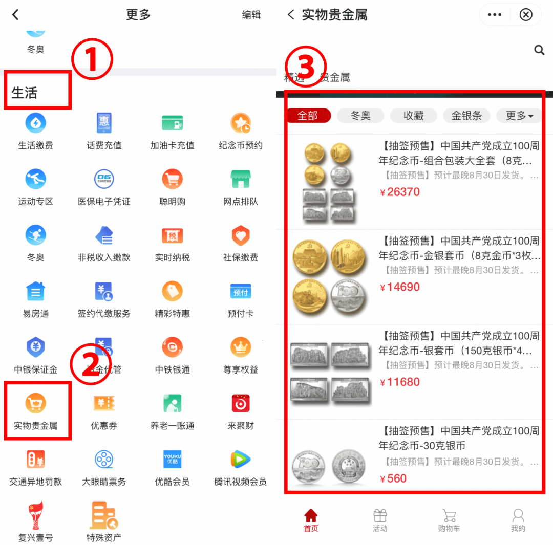 ②点击“投资理财—全部投资产品—实物贵金属”即可开始抽签预约。