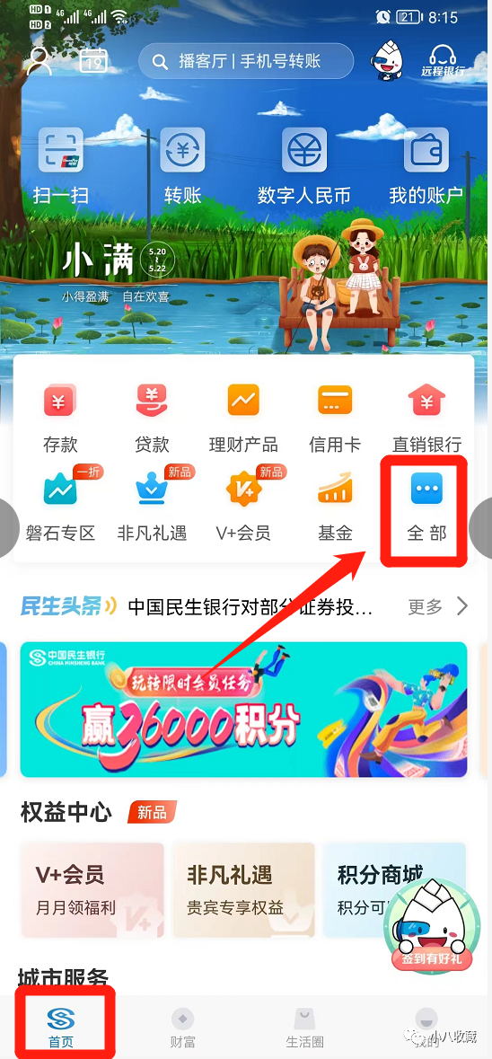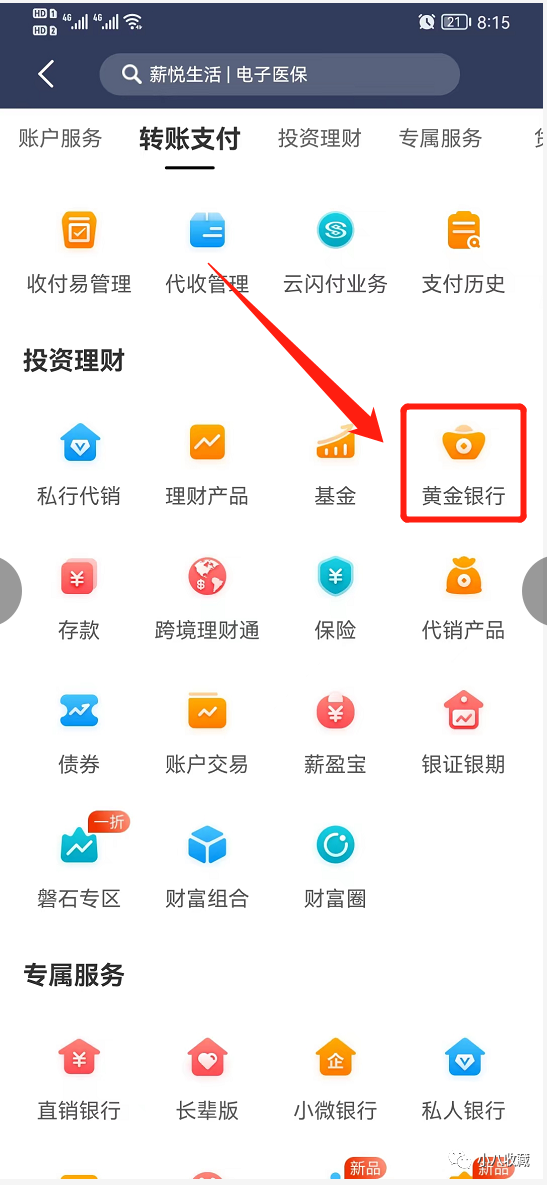 ②在首页处点击“全部”,然后在“投资理财”处找到“黄金银行”,进入后点击“实物金”即可!