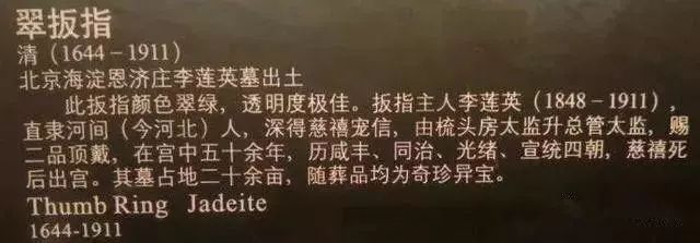 李莲英的所有藏品中,最有名的是一个翡翠扳指。这个扳指也是李连英墓中出土的,是由考古所转交给了首都博物馆收藏,现在是国家一级文物,如今在首都博物馆6层的玉器陈列室展台展出,经常有收藏人士为了参观这个翡翠扳指来到北京博物馆。这个翡翠扳指颜色翠绿,透明度极佳,称得上是首都博物馆的镇馆之宝。![]()