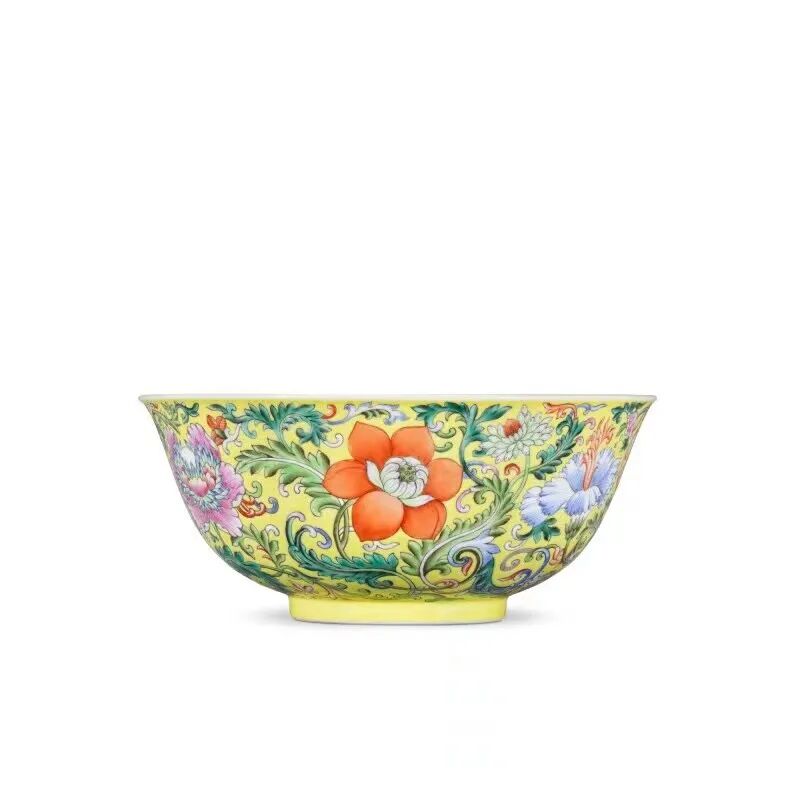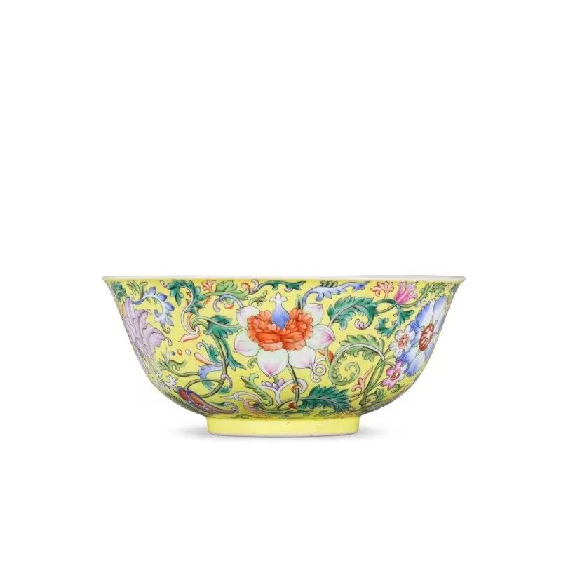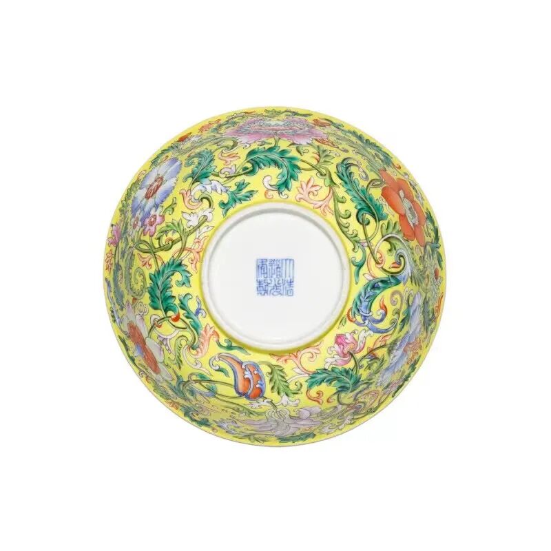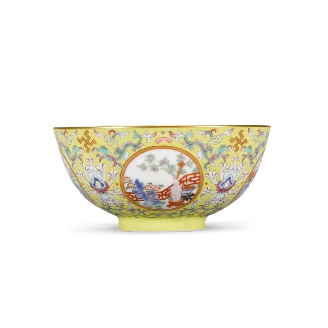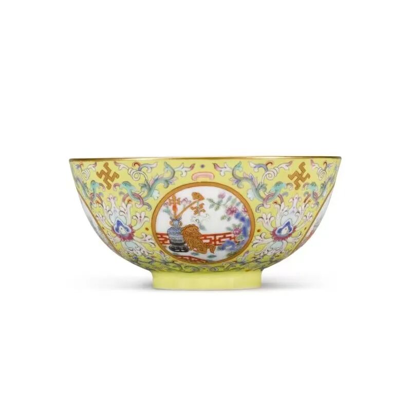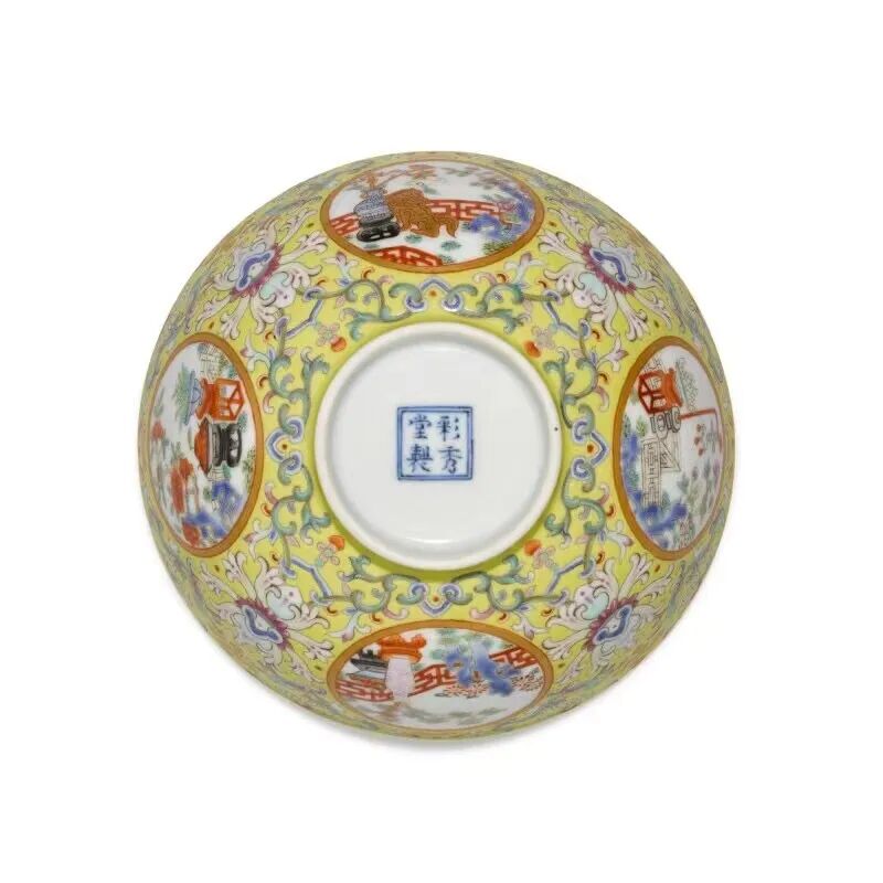黄地粉彩开光清赏纹盌 《彩秀堂制》款